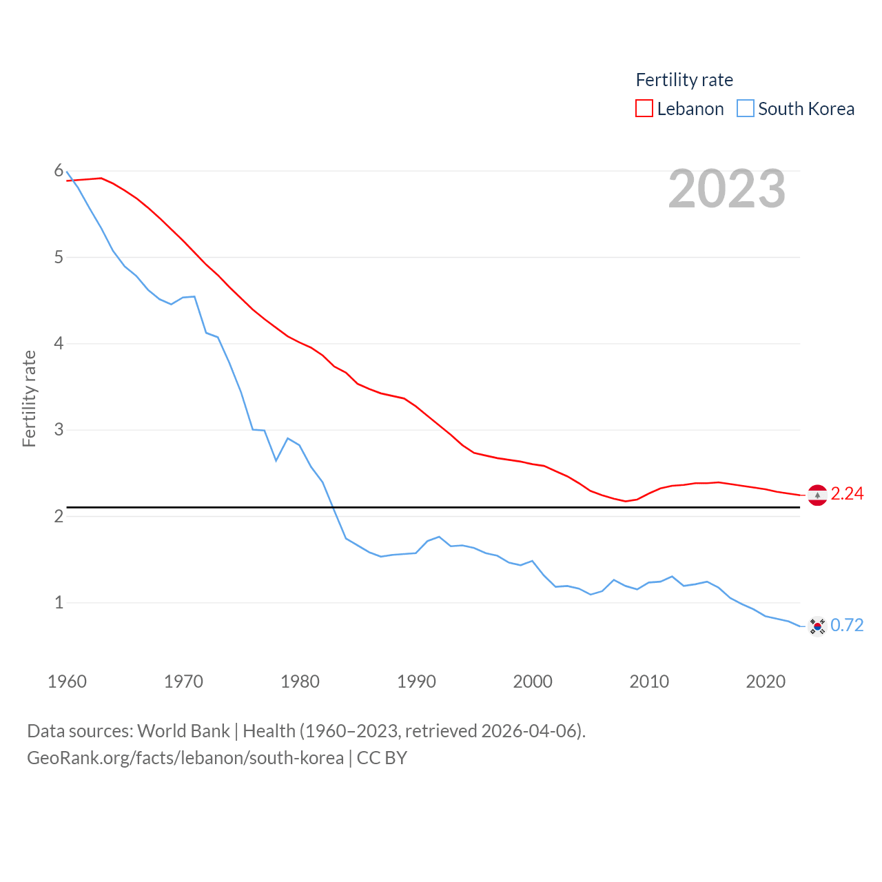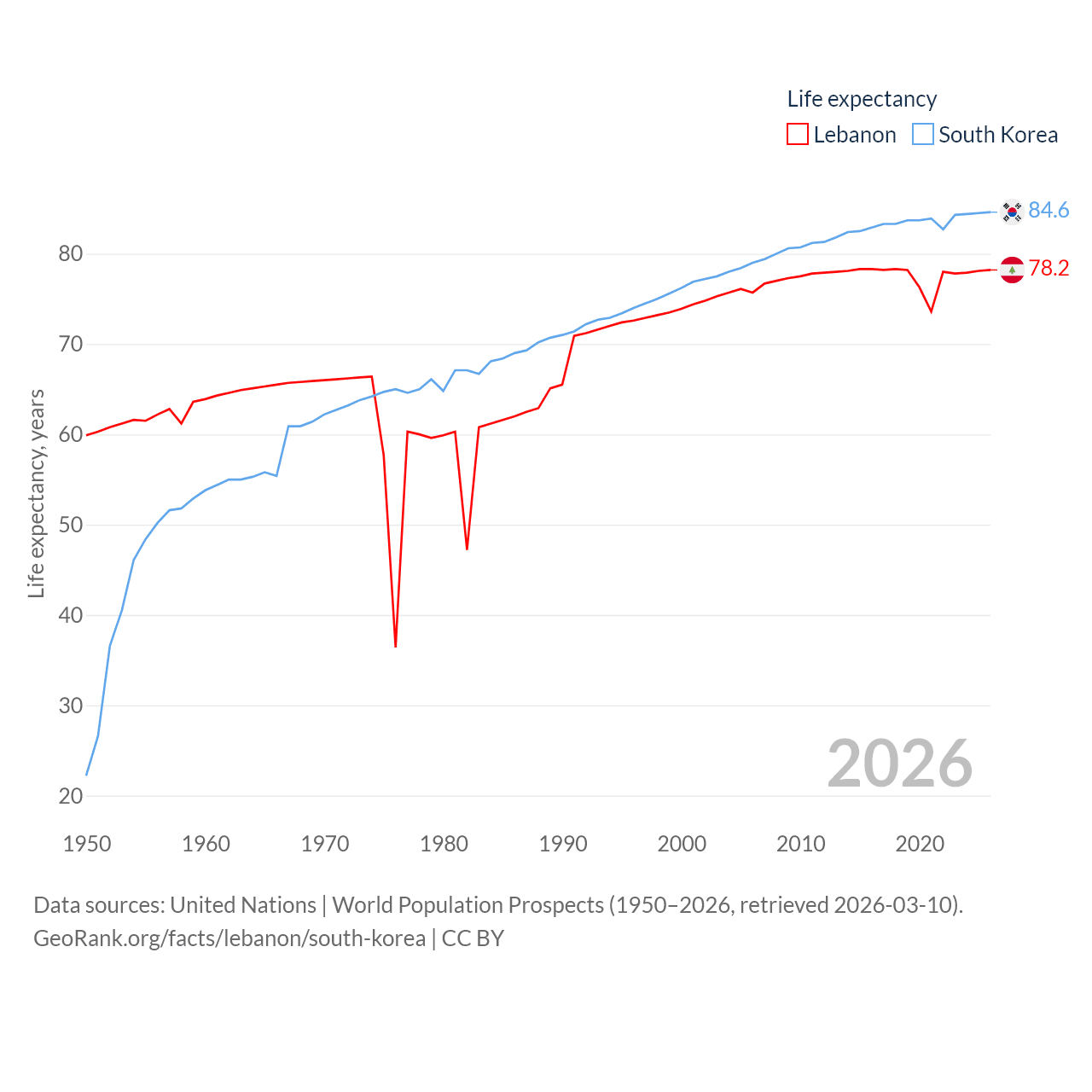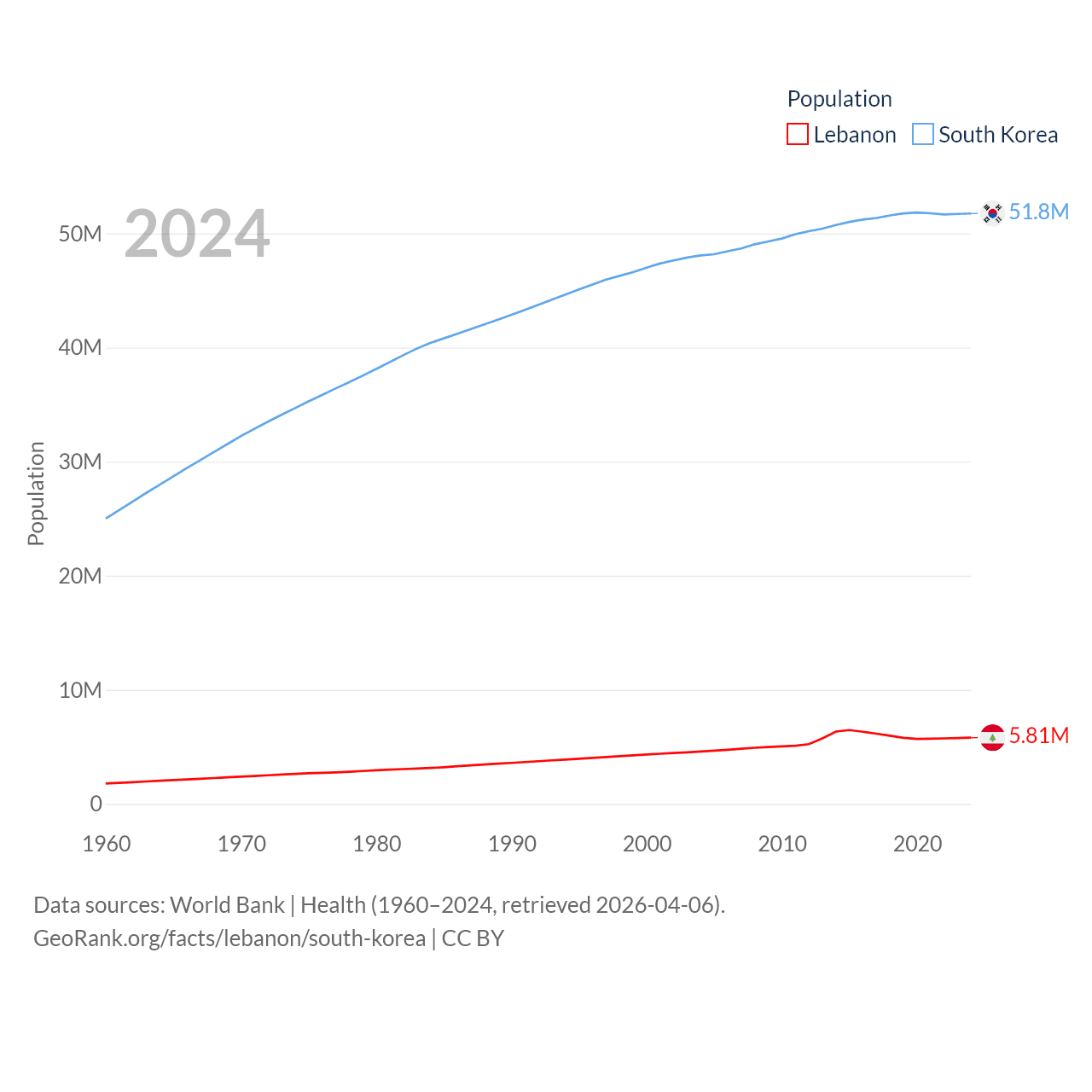 Lebanon has a population of 5.81M (ranked 115/197), compared with 51.8M in South Korea (ranked 29/197). Lebanon's land area is 3,950 sq mi versus 37,684 sq mi for South Korea (ranked 160th vs. 105th).