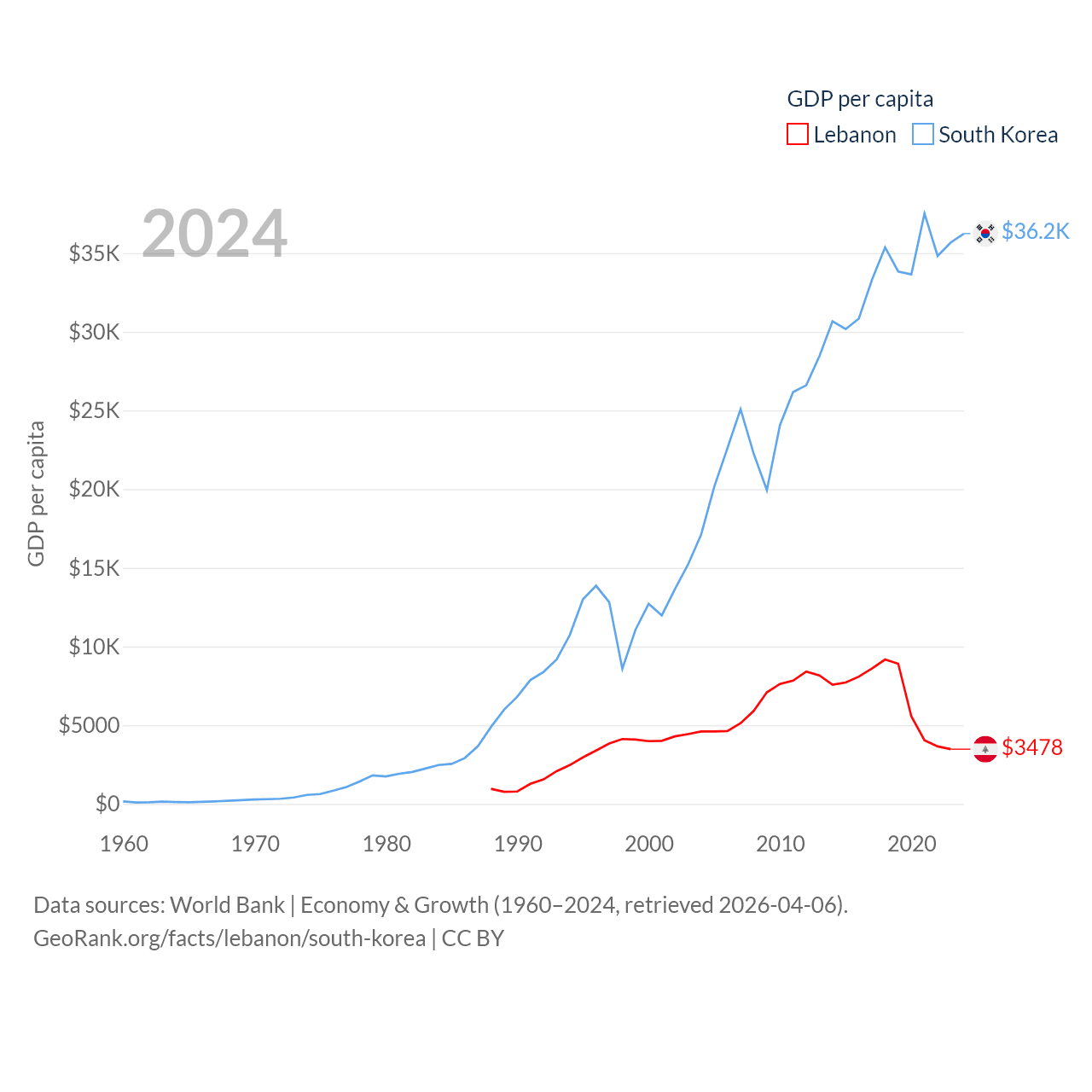 By GDP, Lebanon ranks 128/197 ($20.1B) and South Korea ranks 12/197 ($1.88T). By GDP per capita, Lebanon ranks 135/197 ($3,478), while South Korea ranks 31/197 ($36,239).