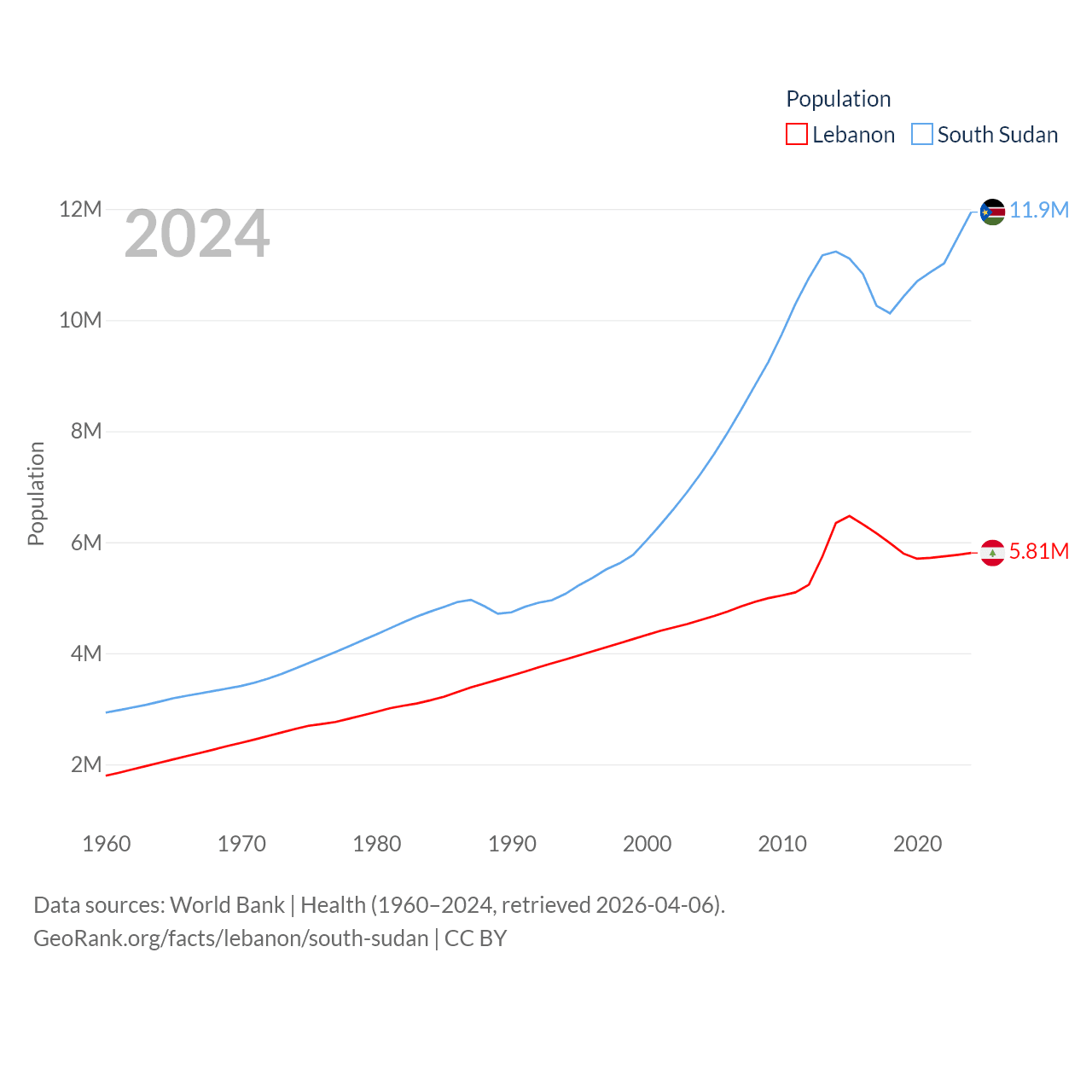 Lebanon has a population of 5.81M (ranked 115/197), compared with 11.9M in South Sudan (ranked 81/197). Lebanon's land area is 3,950 sq mi versus 243,990 sq mi for South Sudan (ranked 160th vs. 41st).