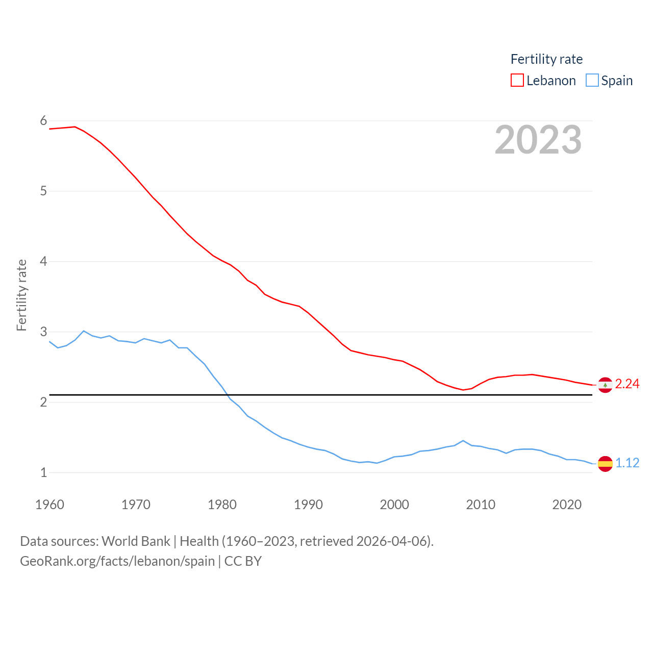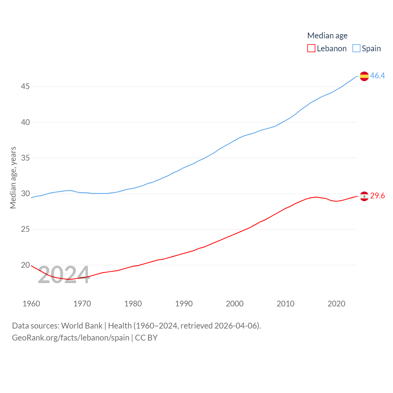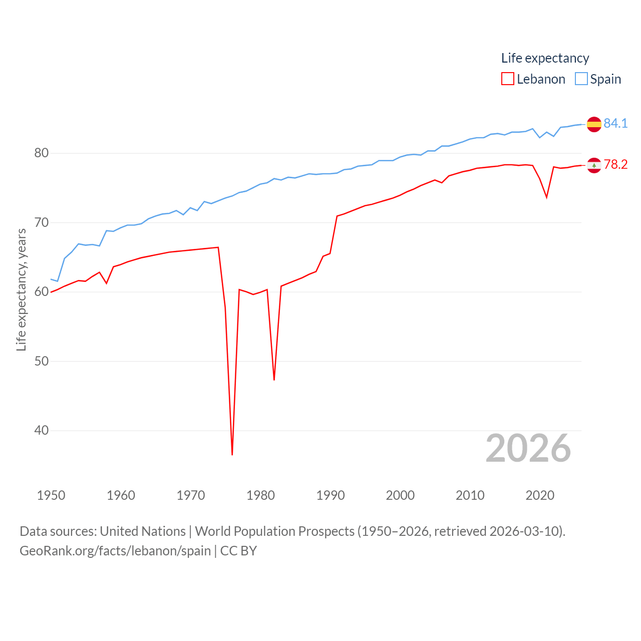 Lebanon has a population of 5.81M (ranked 115/197), compared with 48.8M in Spain (ranked 32/197). Lebanon's land area is 3,950 sq mi versus 192,934 sq mi for Spain (ranked 160th vs. 51st).