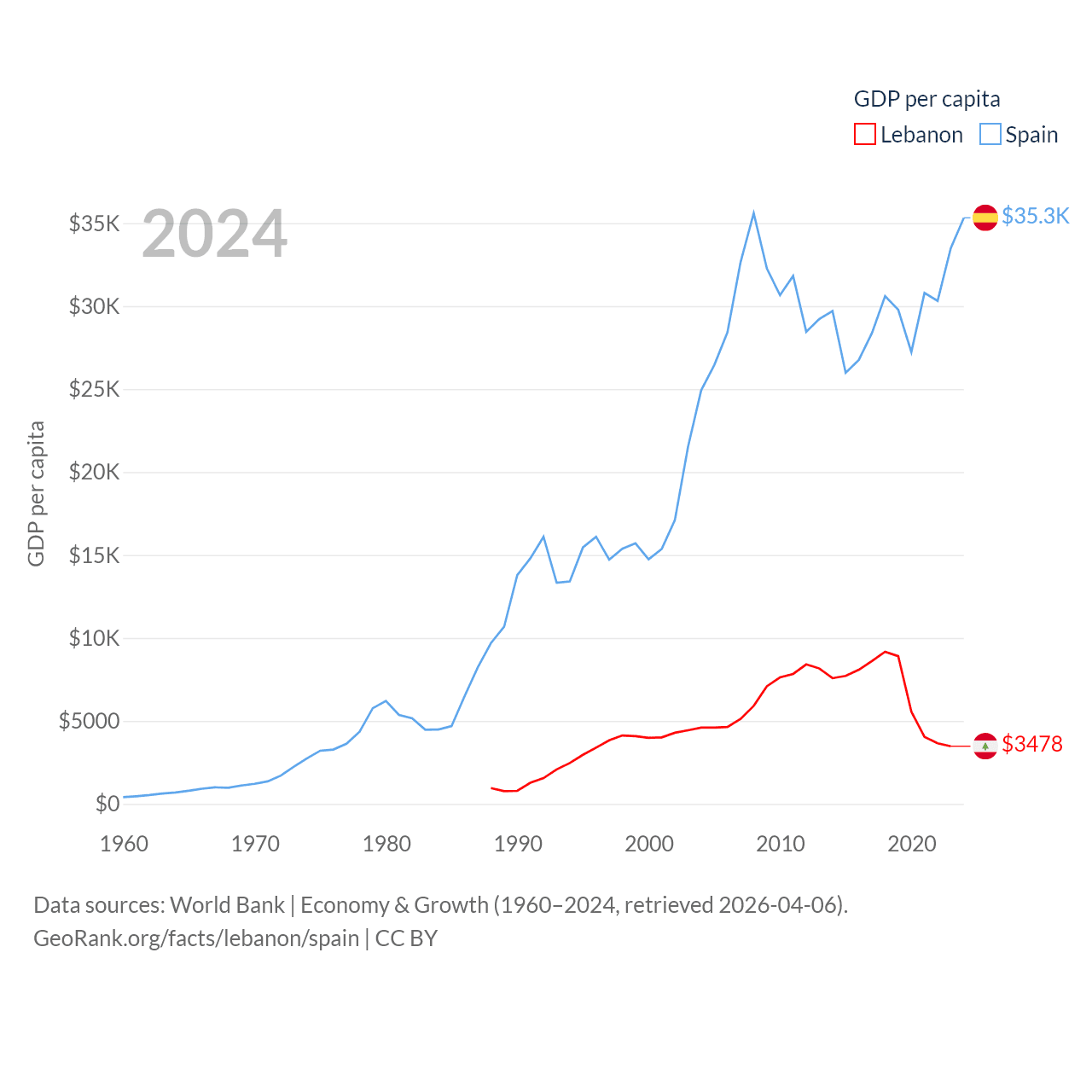 By GDP, Lebanon ranks 128/197 ($20.1B) and Spain ranks 15/197 ($1.73T). By GDP per capita, Lebanon ranks 135/197 ($3,478), while Spain ranks 32/197 ($35,327).