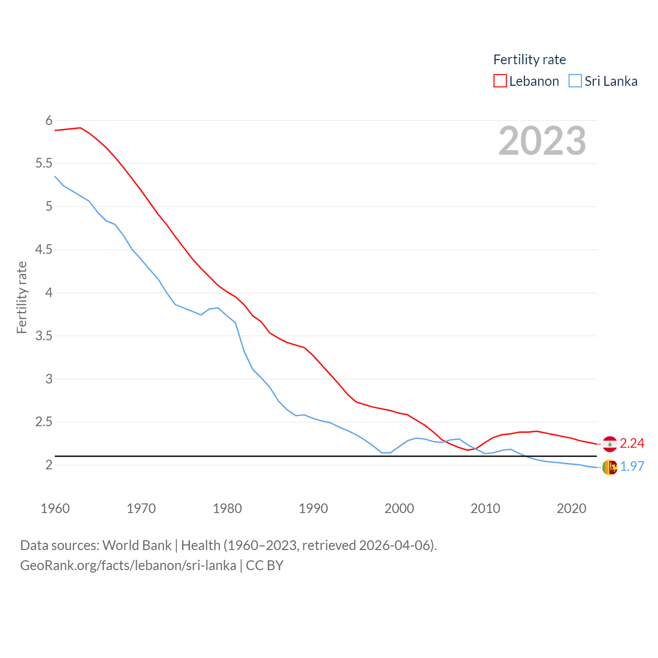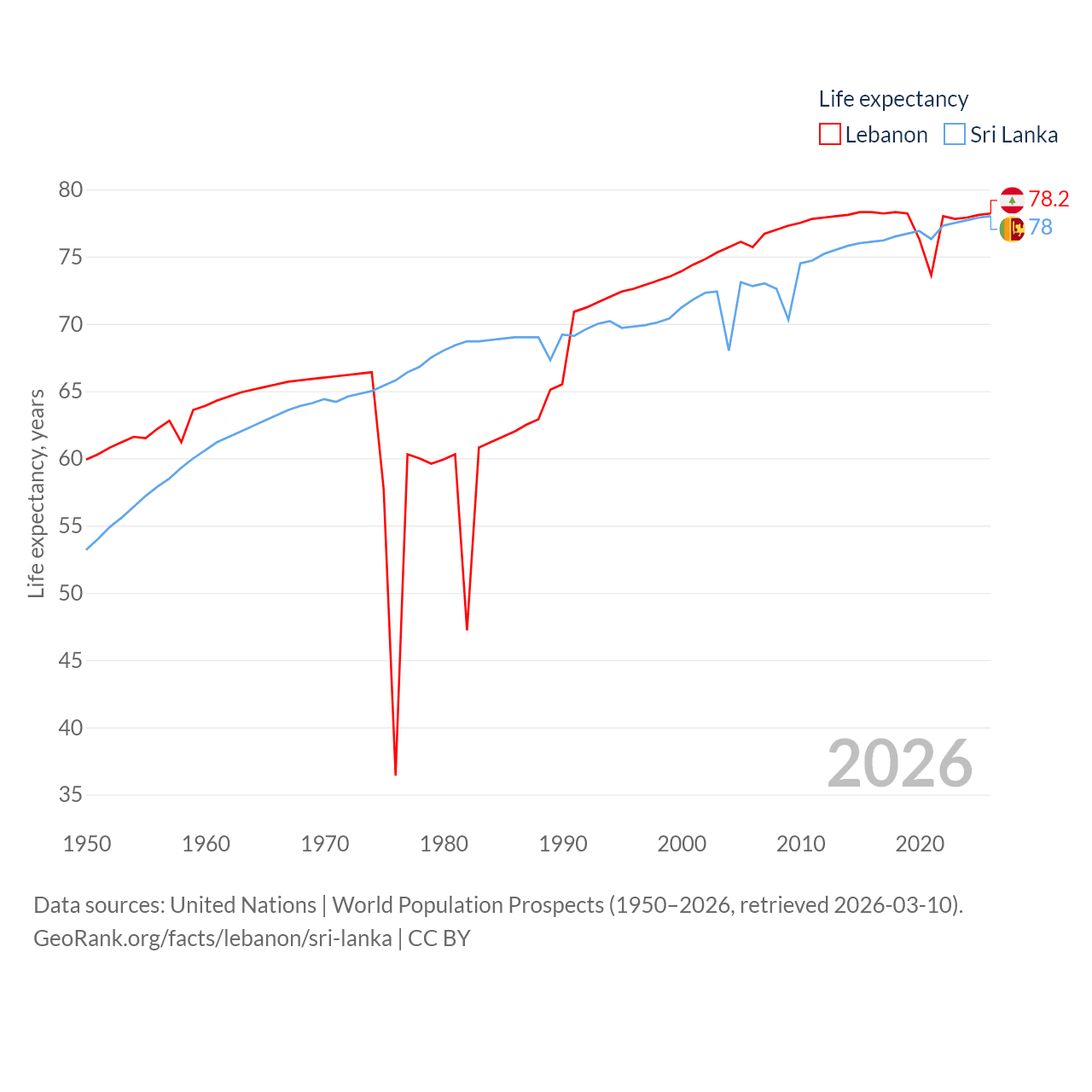 Lebanon has a population of 5.81M (ranked 115/197), compared with 21.9M in Sri Lanka (ranked 61/197). Lebanon's land area is 3,950 sq mi versus 23,884 sq mi for Sri Lanka (ranked 160th vs. 122nd).