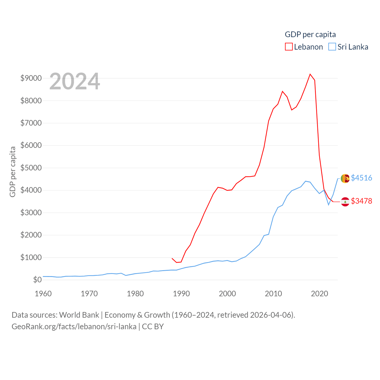 By GDP, Lebanon ranks 128/197 ($20.1B) and Sri Lanka ranks 72/197 ($99B). By GDP per capita, Lebanon ranks 135/197 ($3,478), while Sri Lanka ranks 124/197 ($4,516).