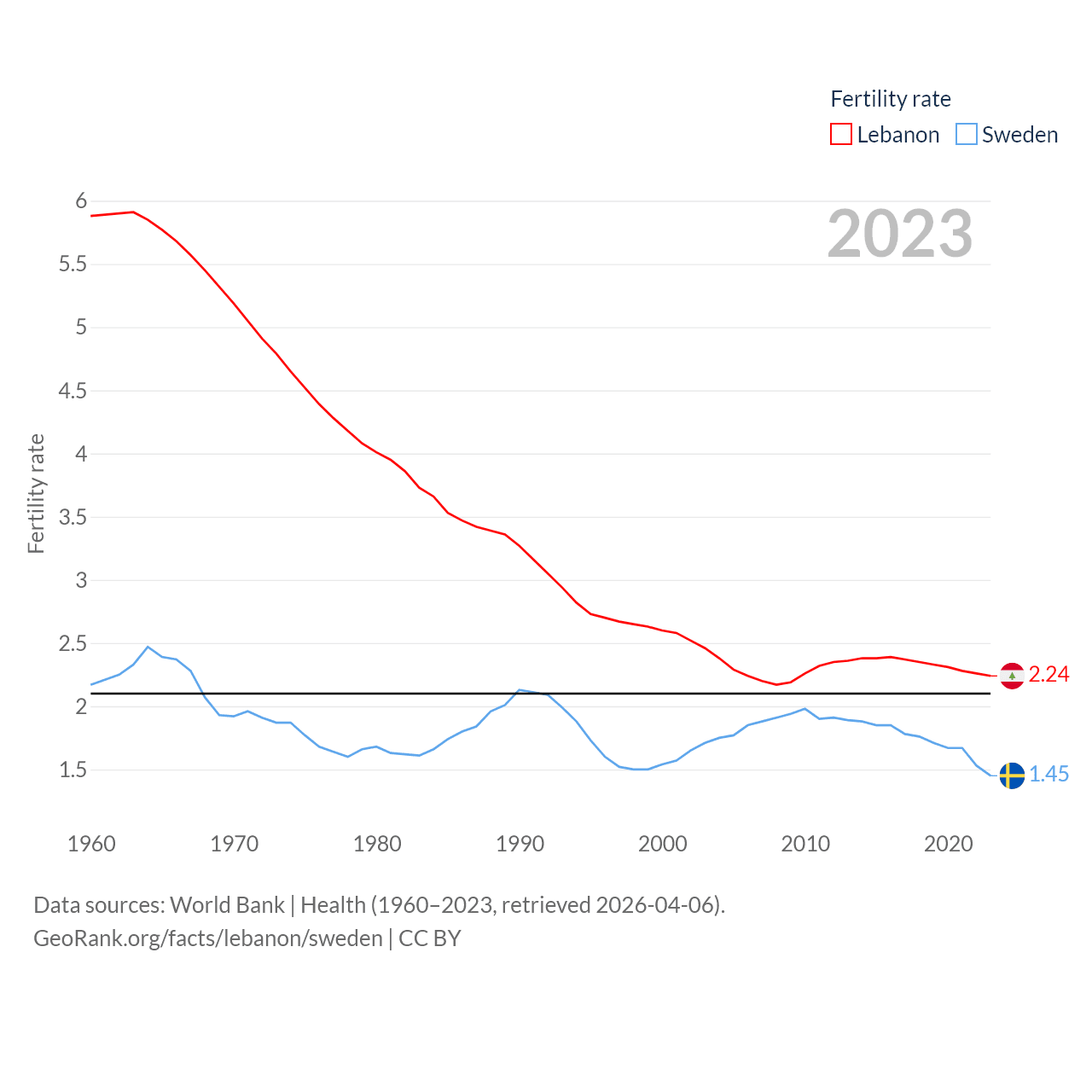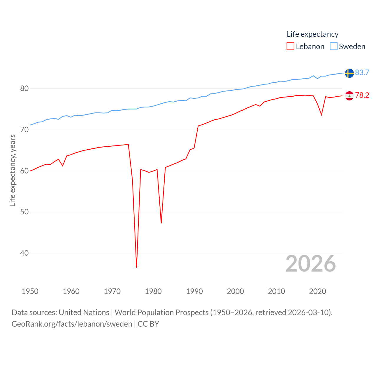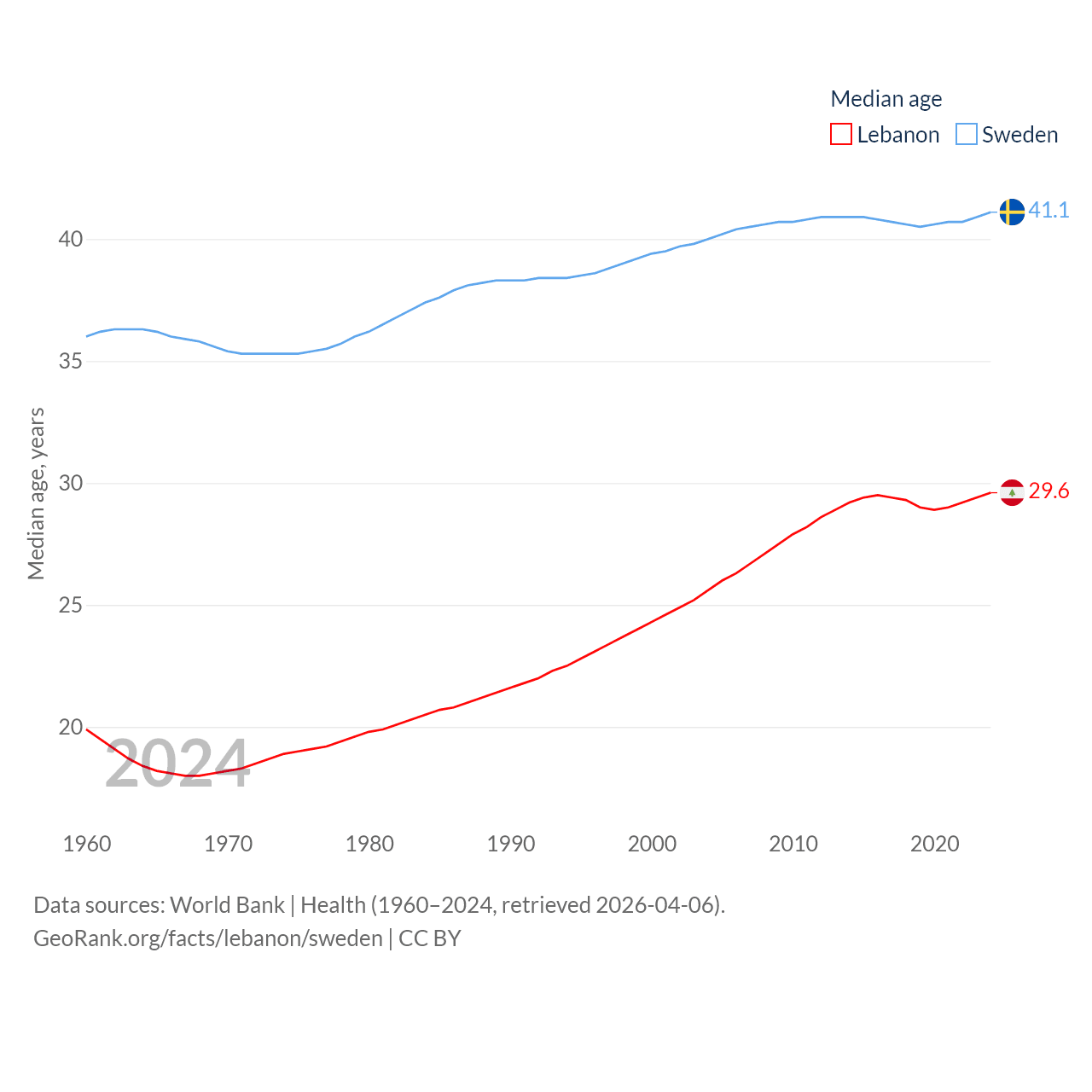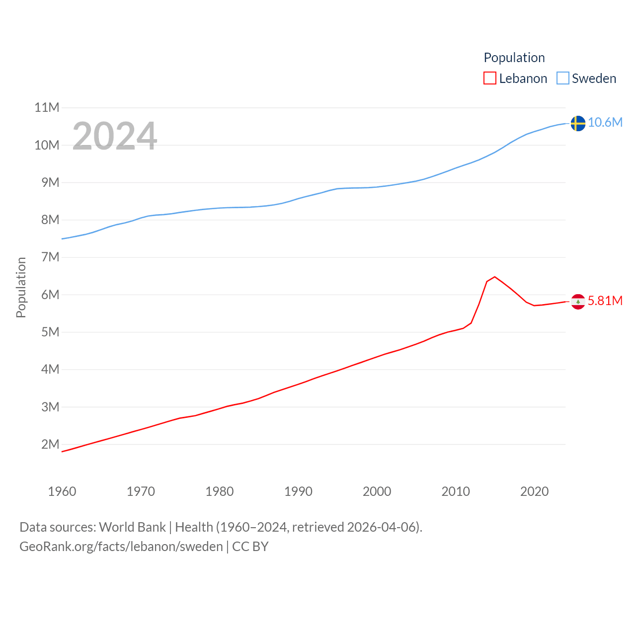 Lebanon has a population of 5.81M (ranked 115/197), compared with 10.6M in Sweden (ranked 93/197). Lebanon's land area is 3,950 sq mi versus 157,248 sq mi for Sweden (ranked 160th vs. 58th).