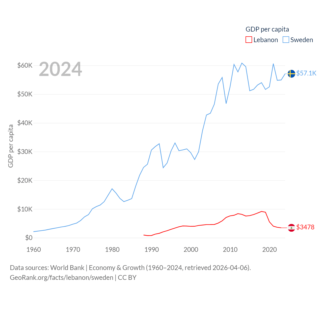 By GDP, Lebanon ranks 128/197 ($20.1B) and Sweden ranks 26/197 ($604B). By GDP per capita, Lebanon ranks 135/197 ($3,478), while Sweden ranks 17/197 ($57,117).