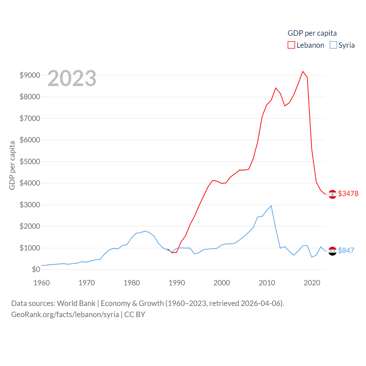 By GDP, Lebanon ranks 128/197 ($20.1B) and Syria ranks 129/197 ($20B). By GDP per capita, Lebanon ranks 135/197 ($3,478), while Syria ranks 185/197 ($847).