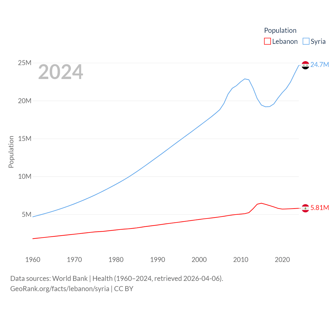 Lebanon has a population of 5.81M (ranked 115/197), compared with 24.7M in Syria (ranked 57/197). Lebanon's land area is 3,950 sq mi versus 70,900 sq mi for Syria (ranked 160th vs. 87th).