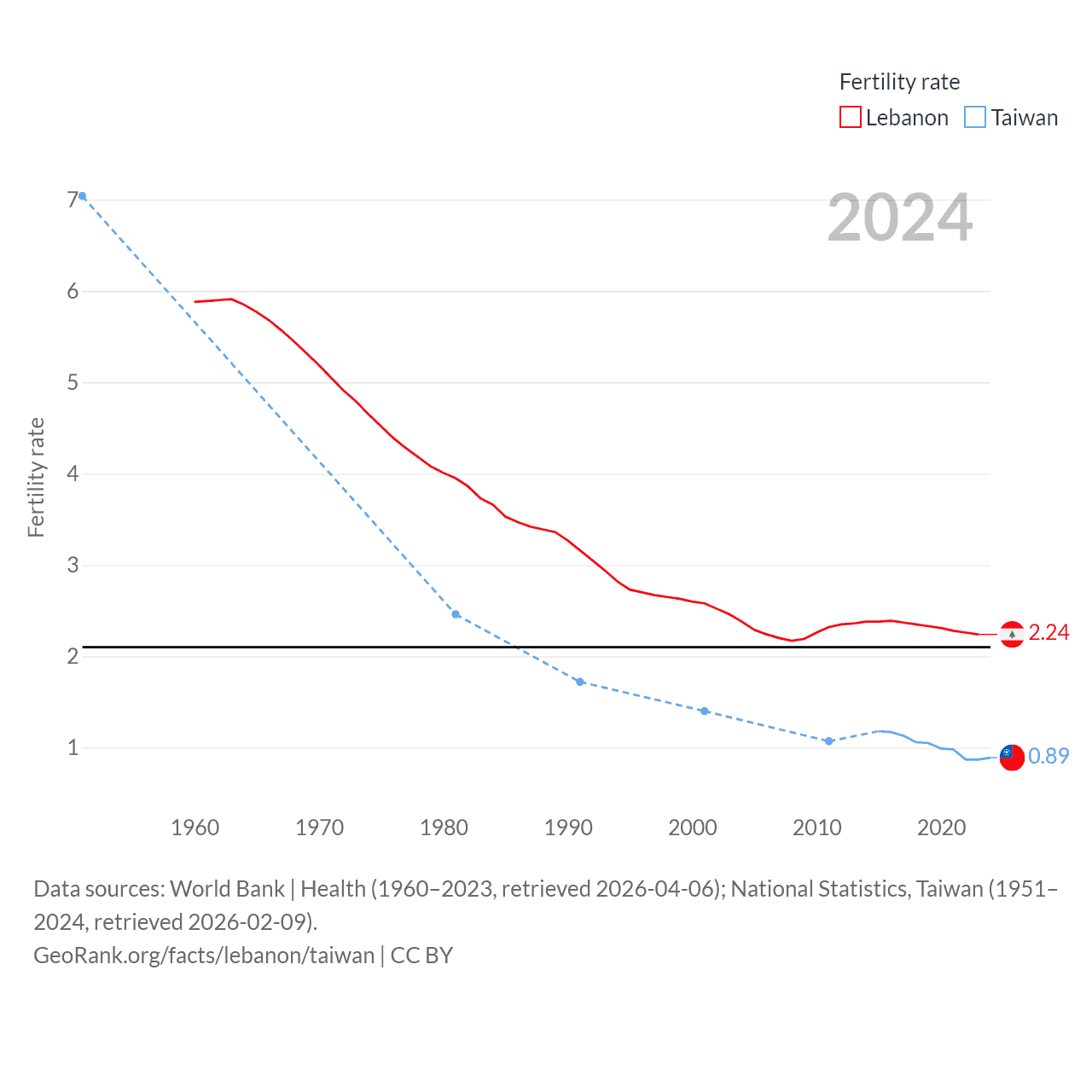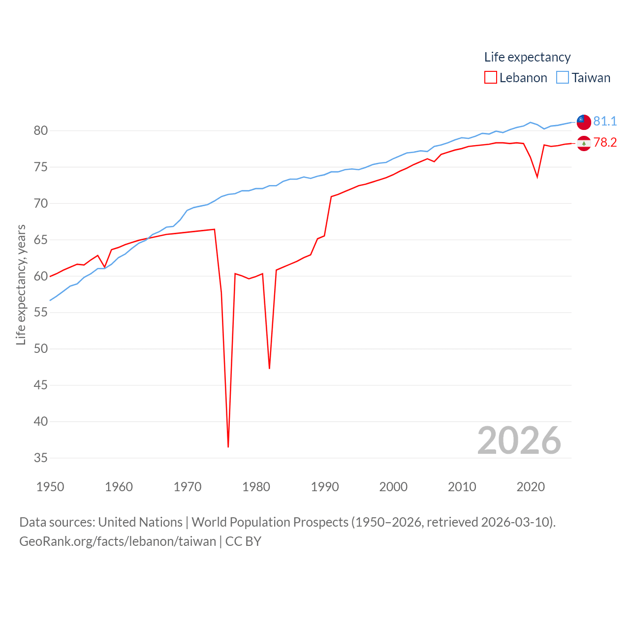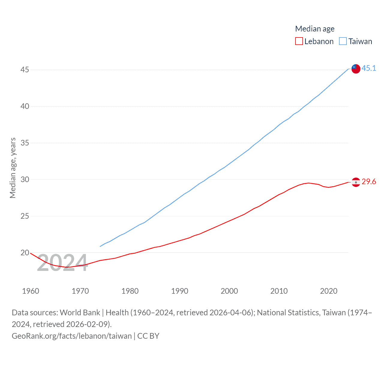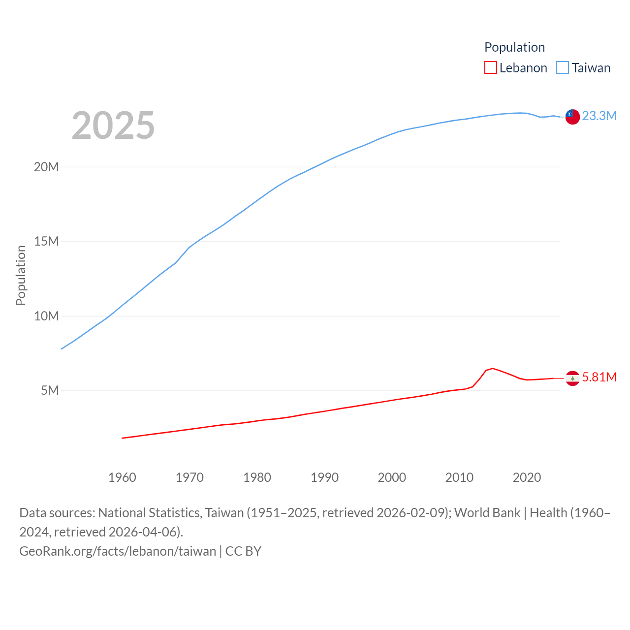 Lebanon has a population of 5.81M (ranked 115/197), compared with 23.3M in Taiwan (ranked 60/197). Lebanon's land area is 3,950 sq mi versus 13,976 sq mi for Taiwan (ranked 160th vs. 133rd).