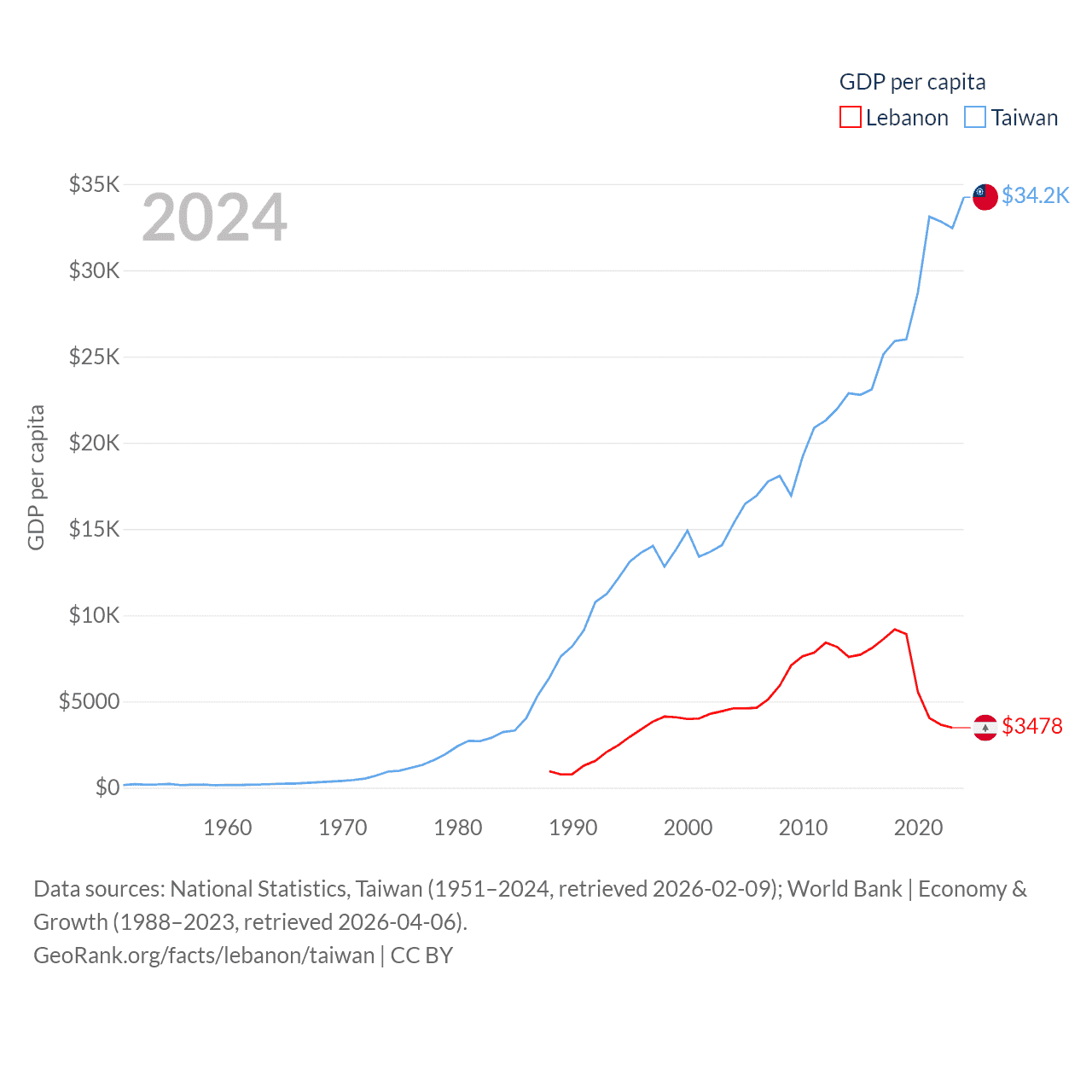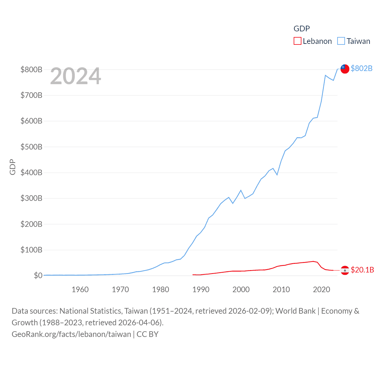 By GDP, Lebanon ranks 128/197 ($20.1B) and Taiwan ranks 22/197 ($802B). By GDP per capita, Lebanon ranks 135/197 ($3,478), while Taiwan ranks 35/197 ($34,238).