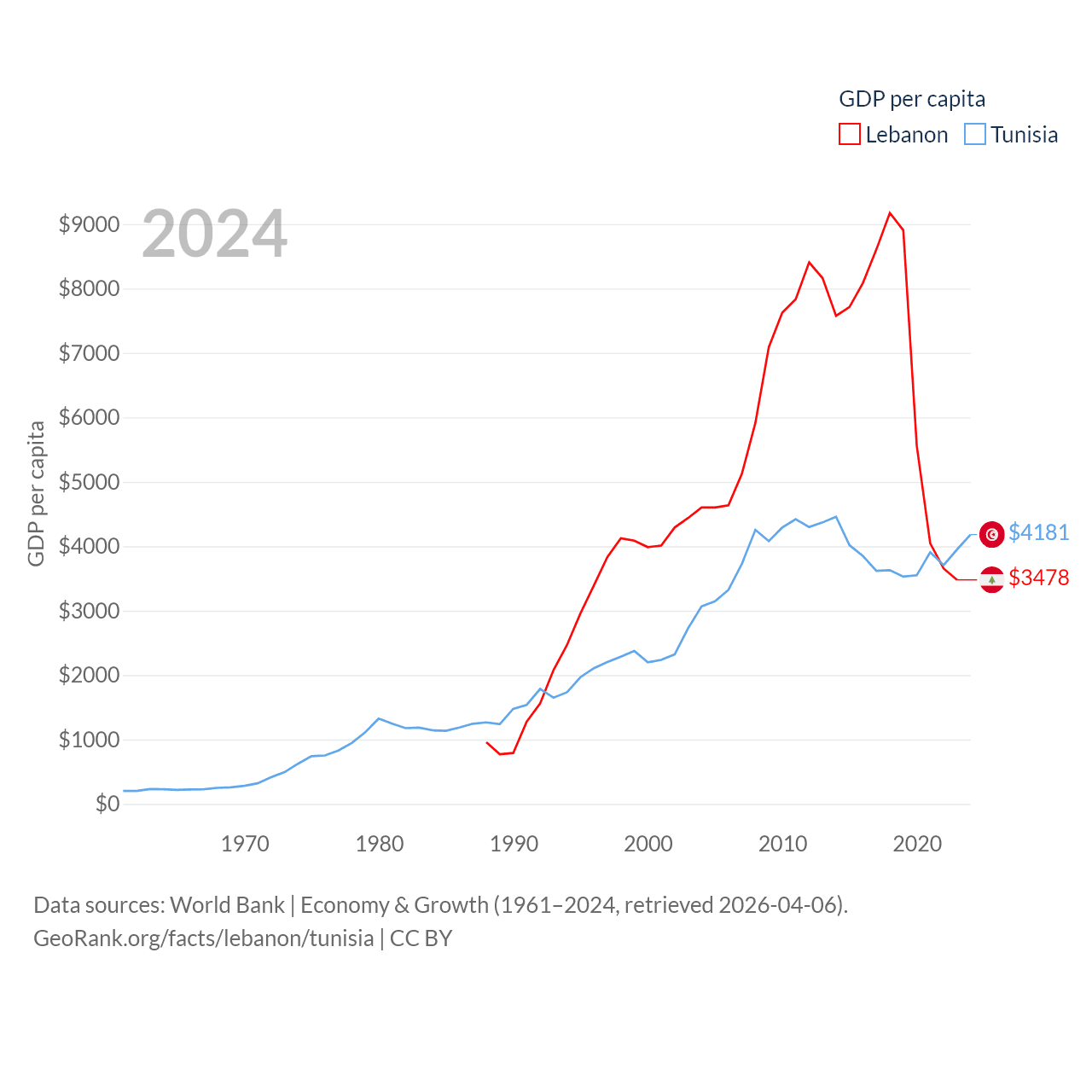 By GDP, Lebanon ranks 128/197 ($20.1B) and Tunisia ranks 93/197 ($51.3B). By GDP per capita, Lebanon ranks 135/197 ($3,478), while Tunisia ranks 129/197 ($4,181).