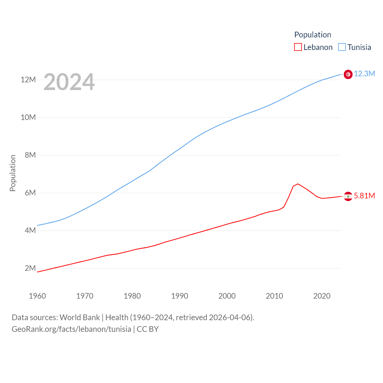 Lebanon has a population of 5.81M (ranked 115/197), compared with 12.3M in Tunisia (ranked 80/197). Lebanon's land area is 3,950 sq mi versus 59,985 sq mi for Tunisia (ranked 160th vs. 91st).