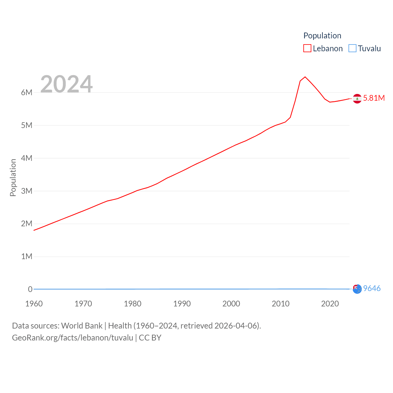 Lebanon has a population of 5.81M (ranked 115/197), compared with 9.65K in Tuvalu (ranked 196/197). Lebanon's land area is 3,950 sq mi versus 11.6 sq mi for Tuvalu (ranked 160th vs. 194th).