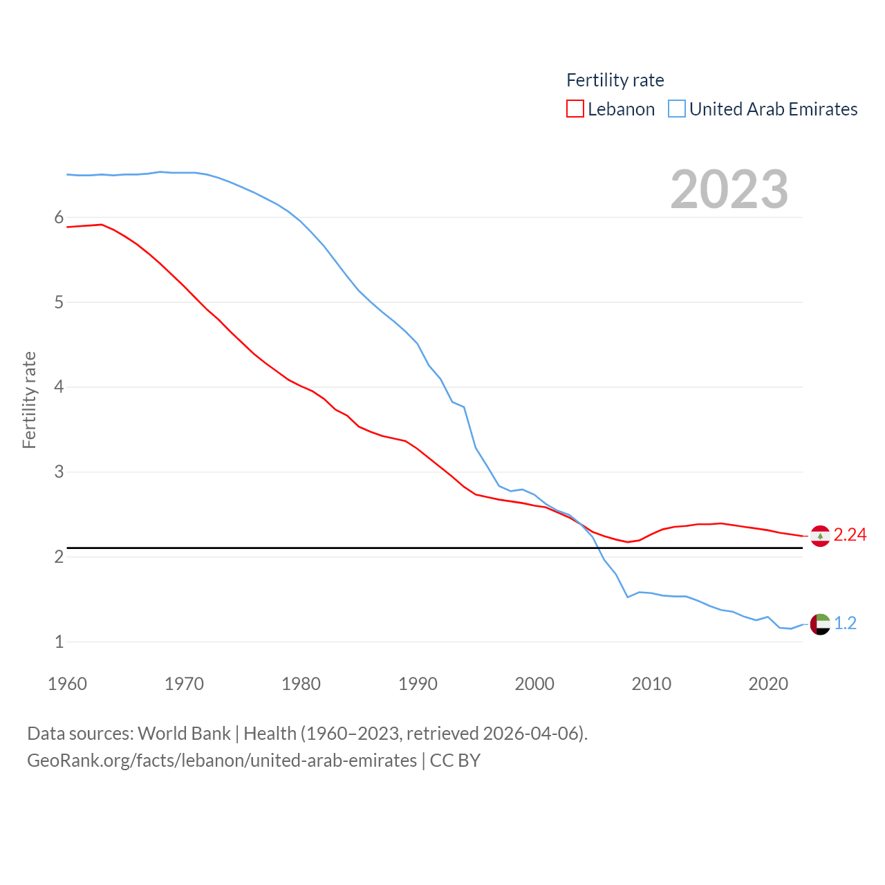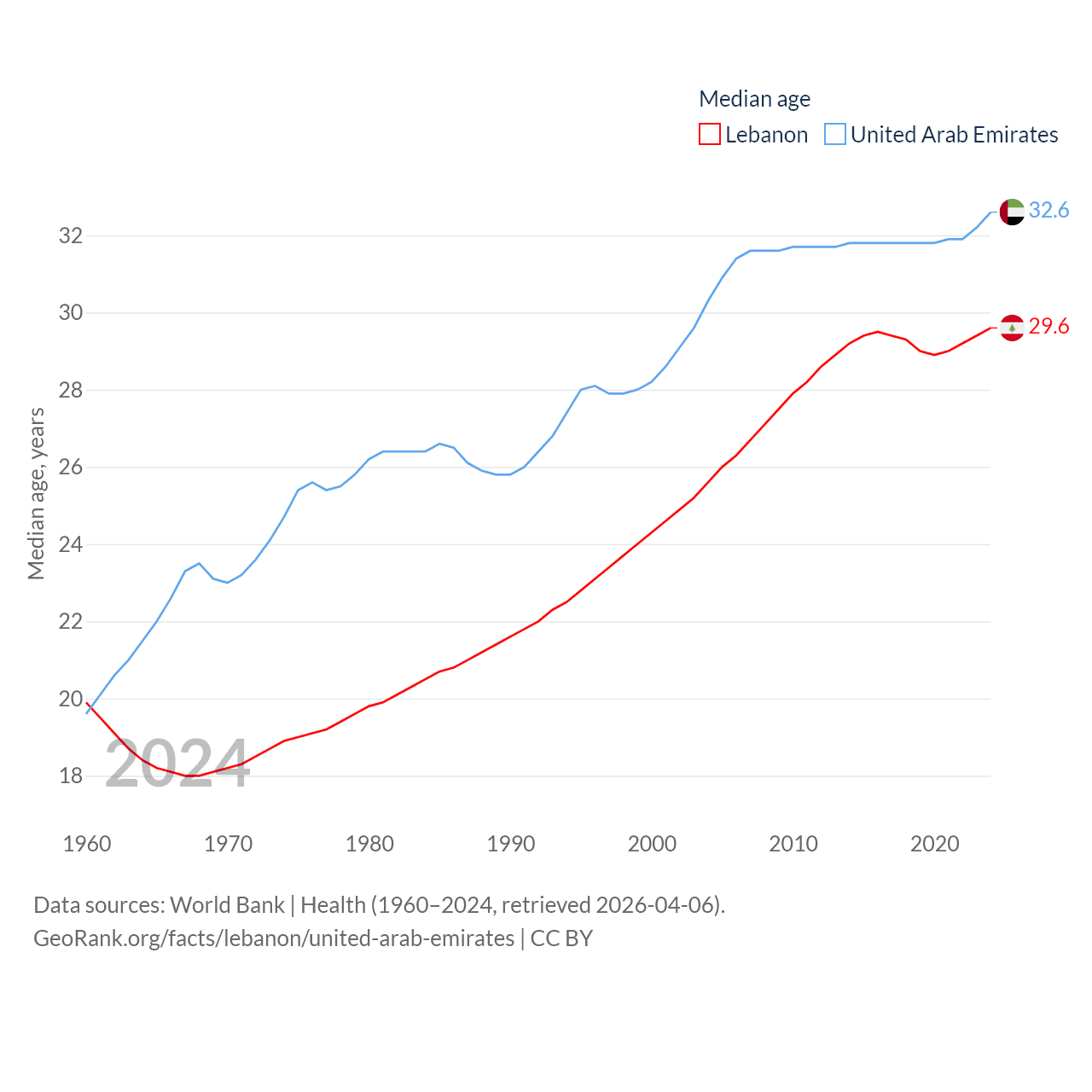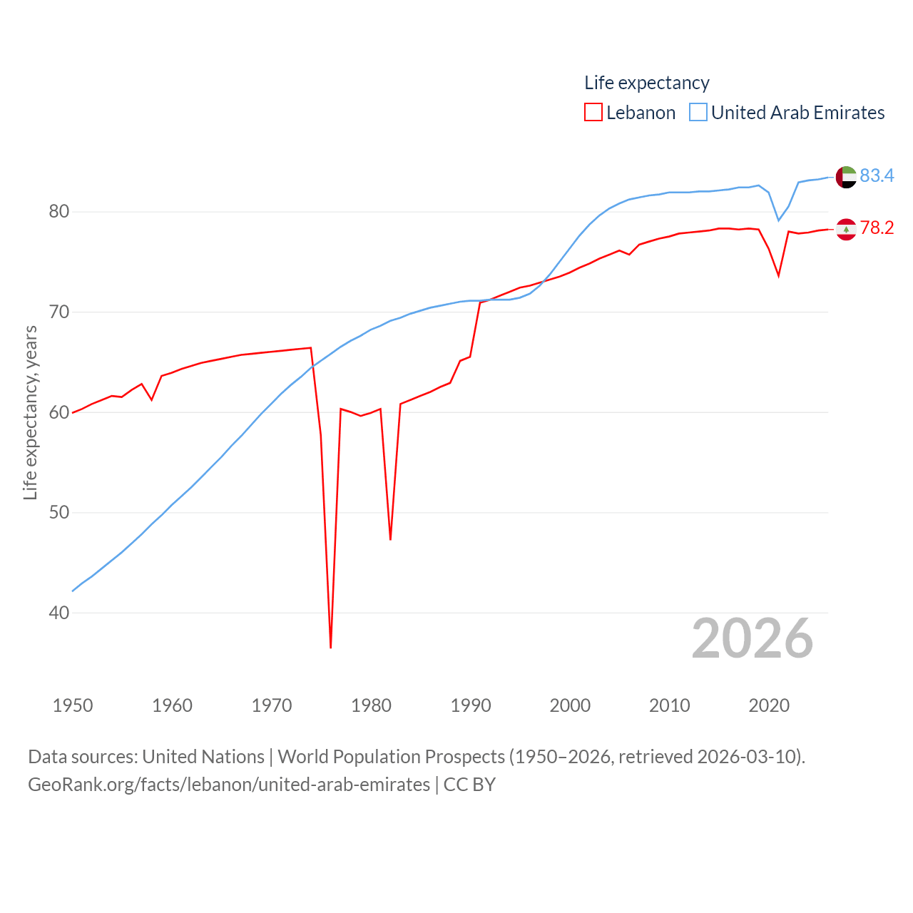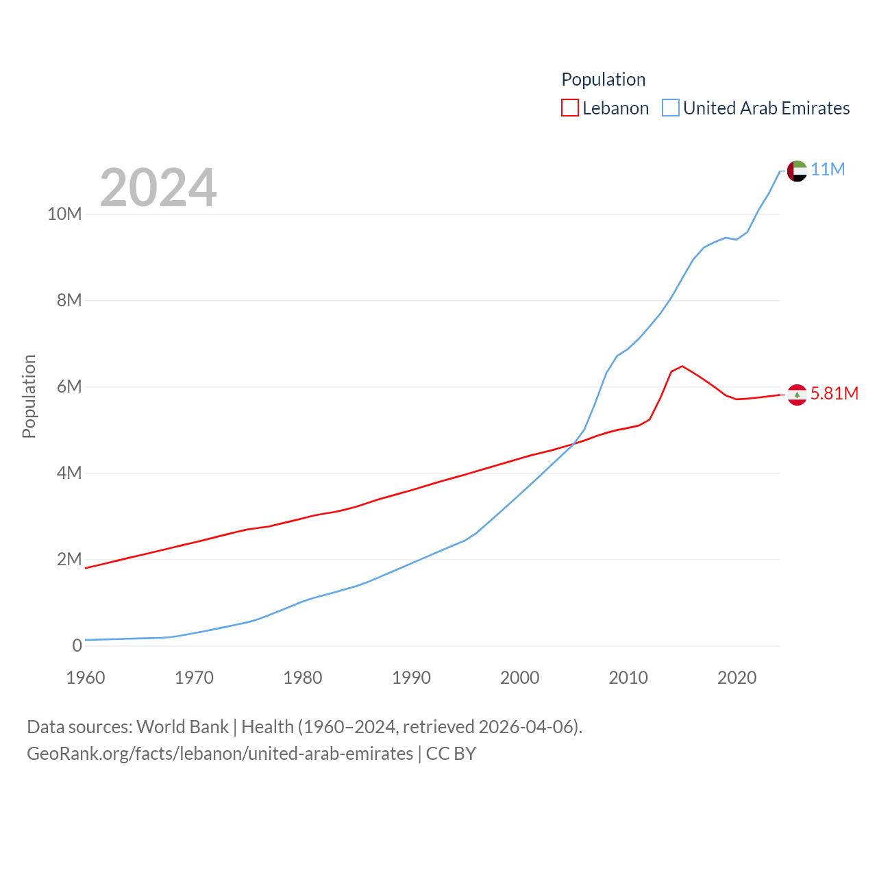Lebanon has a population of 5.81M (ranked 115/197), compared with 11M in The United Arab Emirates (ranked 86/197). Lebanon's land area is 3,950 sq mi versus 27,421 sq mi for The United Arab Emirates (ranked 160th vs. 117th).
