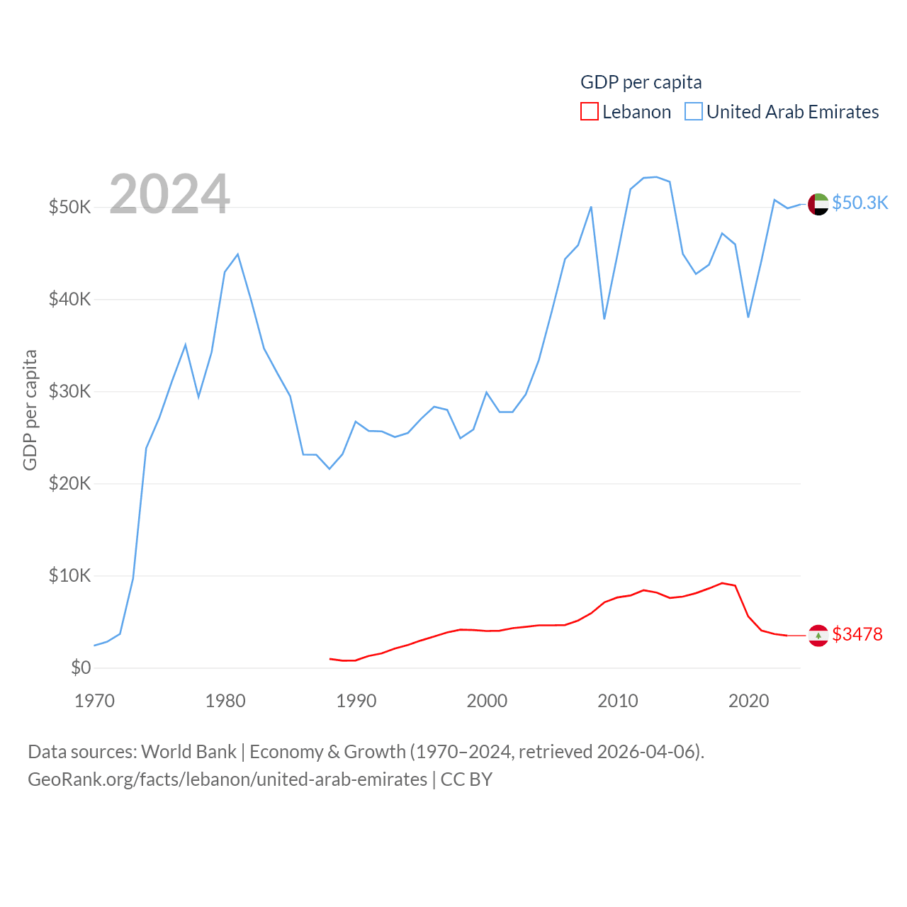 By GDP, Lebanon ranks 128/197 ($20.1B) and The United Arab Emirates ranks 27/197 ($552B). By GDP per capita, Lebanon ranks 135/197 ($3,478), while The United Arab Emirates ranks 24/197 ($50,274).