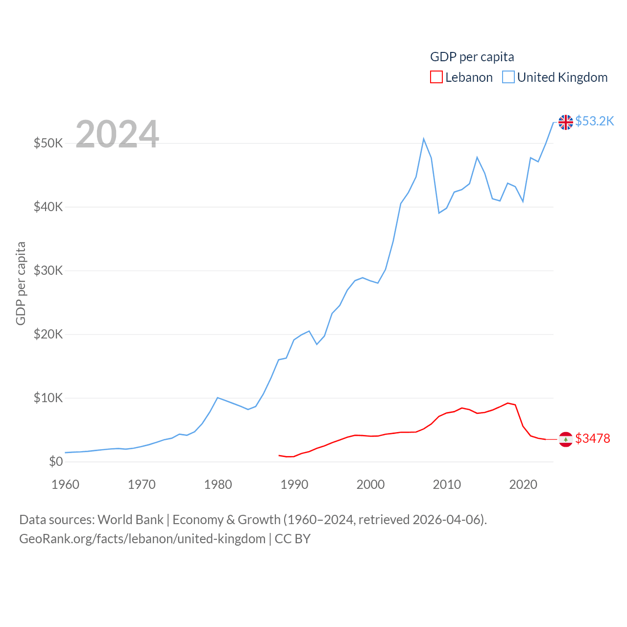 By GDP, Lebanon ranks 128/197 ($20.1B) and The United Kingdom ranks 6/197 ($3.69T). By GDP per capita, Lebanon ranks 135/197 ($3,478), while The United Kingdom ranks 22/197 ($53,246).