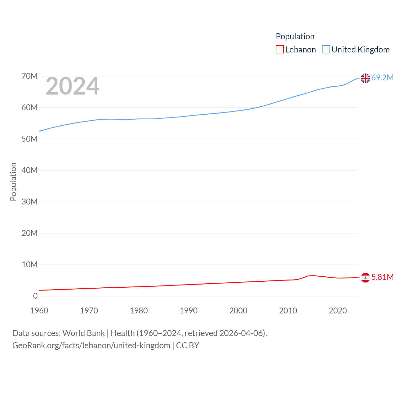 Lebanon has a population of 5.81M (ranked 115/197), compared with 69.2M in The United Kingdom (ranked 21/197). Lebanon's land area is 3,950 sq mi versus 93,410 sq mi for The United Kingdom (ranked 160th vs. 78th).