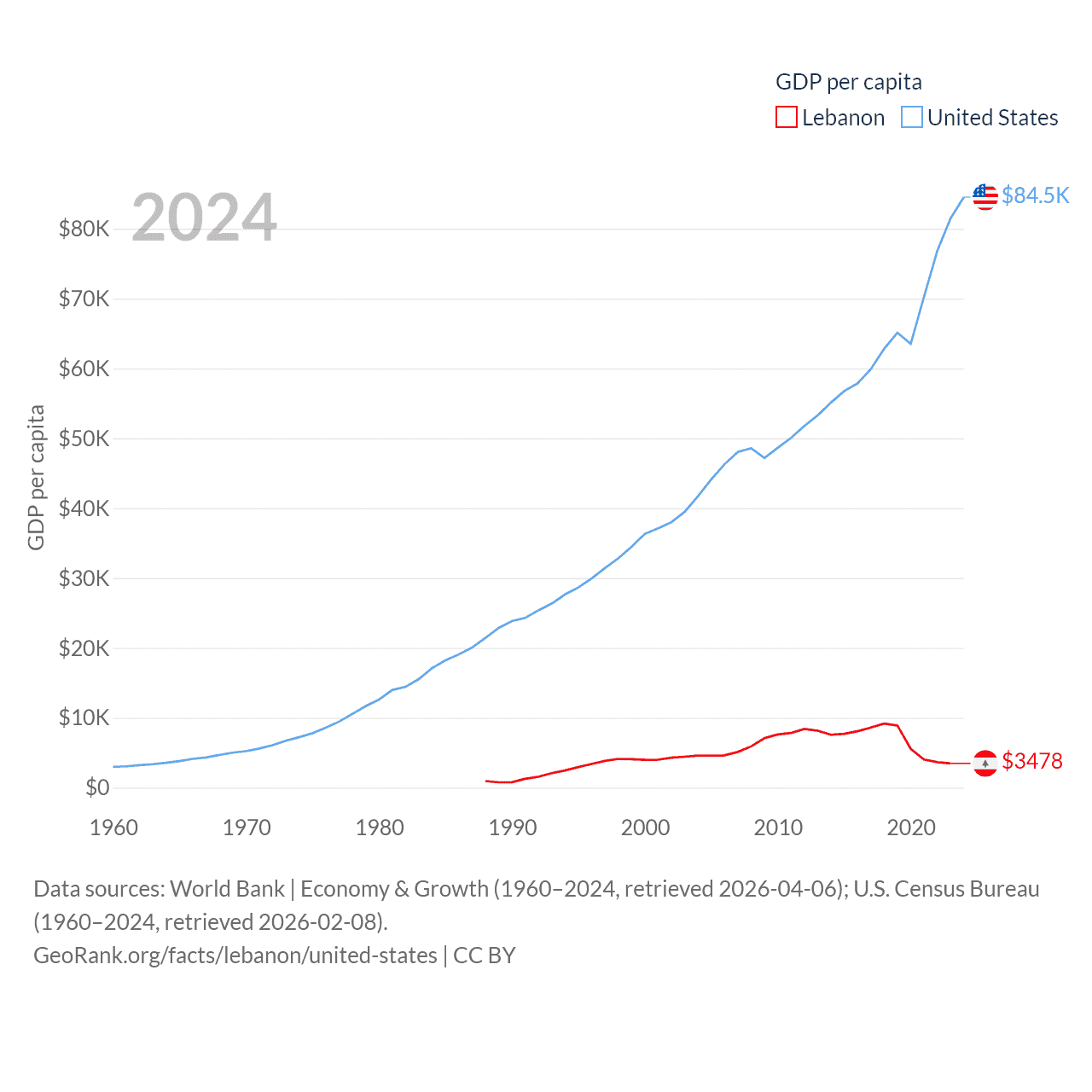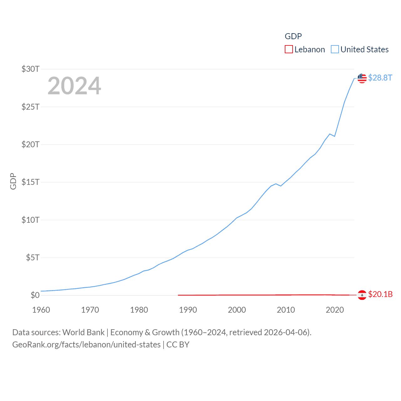 By GDP, Lebanon ranks 128/197 ($20.1B) and The United States ranks 1/197 ($28.8T). By GDP per capita, Lebanon ranks 135/197 ($3,478), while The United States ranks 10/197 ($84,534).