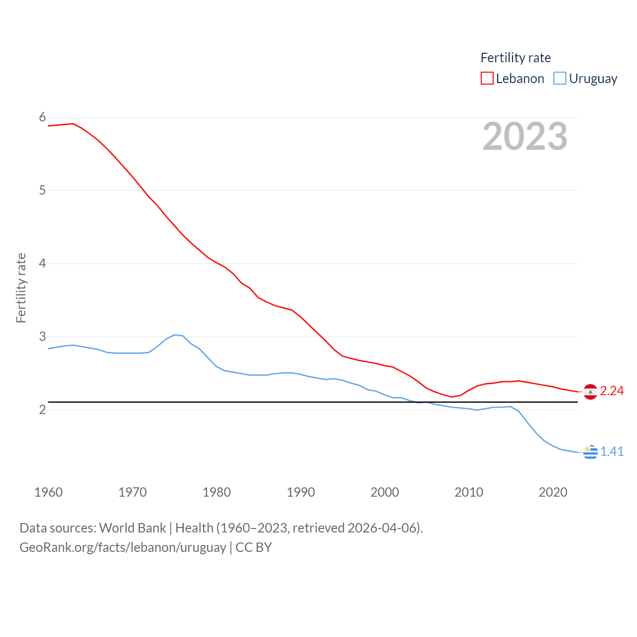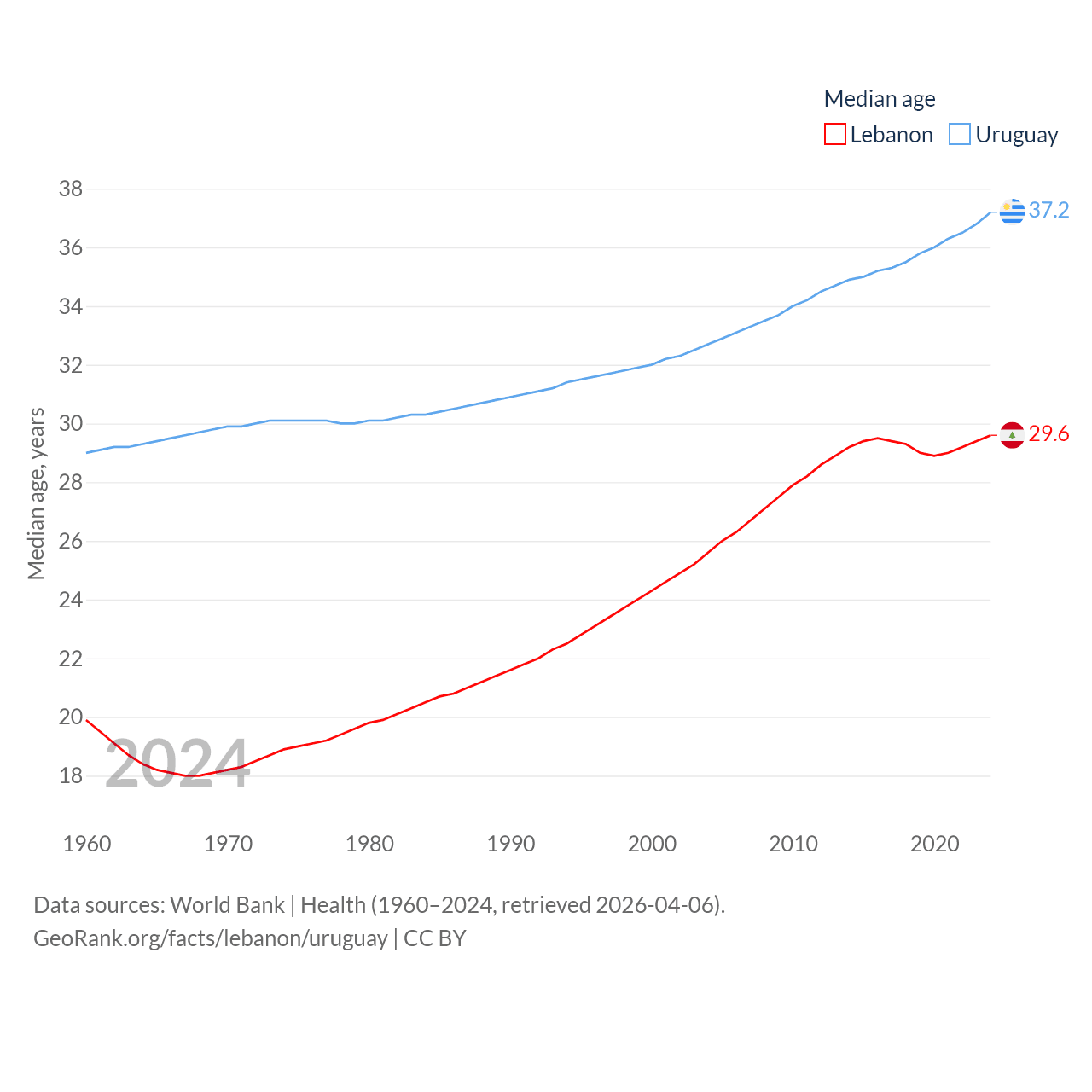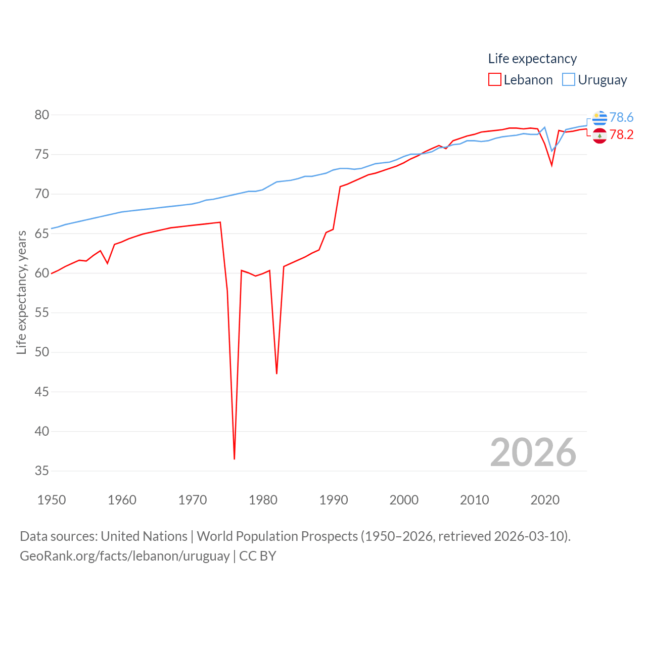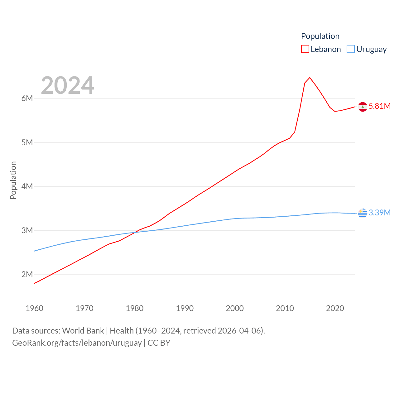 Lebanon has a population of 5.81M (ranked 115/197), compared with 3.39M in Uruguay (ranked 133/197). Lebanon's land area is 3,950 sq mi versus 67,576 sq mi for Uruguay (ranked 160th vs. 89th).