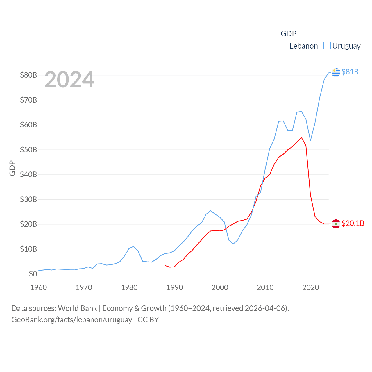 By GDP, Lebanon ranks 128/197 ($20.1B) and Uruguay ranks 81/197 ($81B). By GDP per capita, Lebanon ranks 135/197 ($3,478), while Uruguay ranks 52/197 ($23,907).