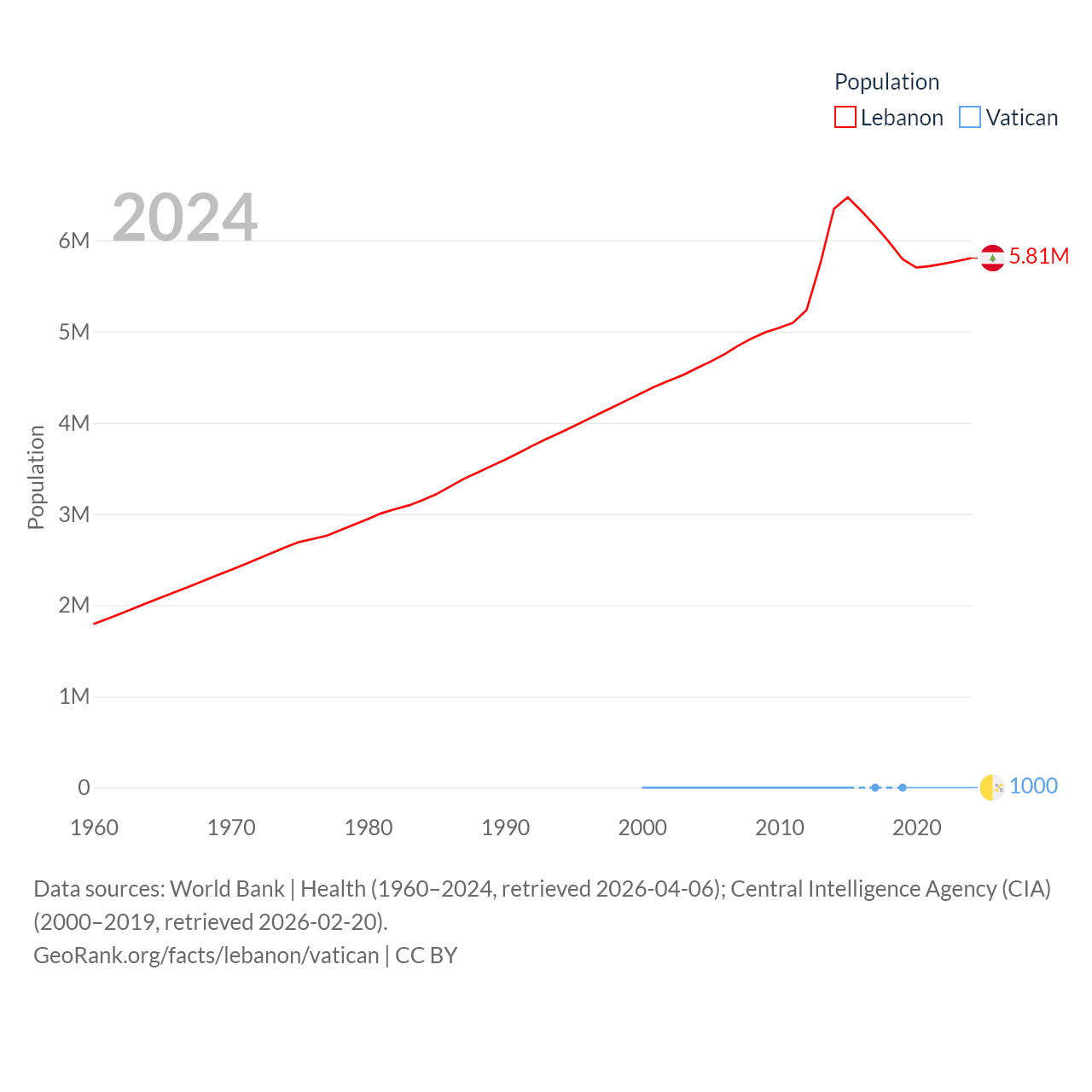 Lebanon has a population of 5.81M (ranked 115/197), compared with 1K in The Vatican (ranked 197/197). Lebanon's land area is 3,950 sq mi versus 0.17 sq mi for The Vatican (ranked 160th vs. 197th).