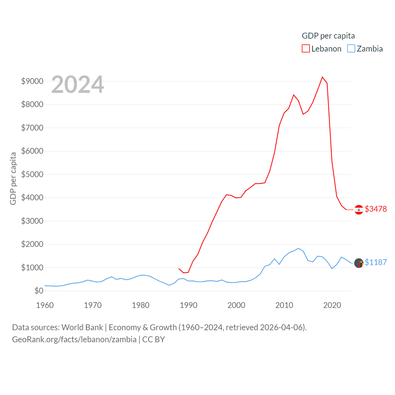 By GDP, Lebanon ranks 128/197 ($20.1B) and Zambia ranks 116/197 ($25.3B). By GDP per capita, Lebanon ranks 135/197 ($3,478), while Zambia ranks 169/197 ($1,187).