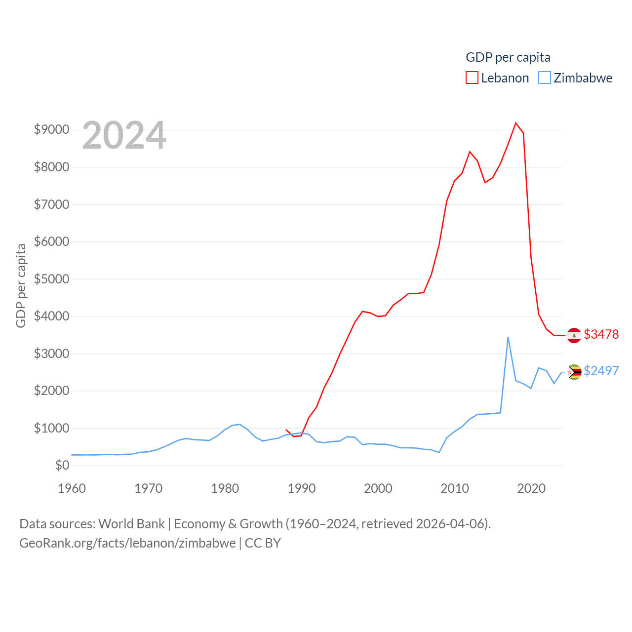 By GDP, Lebanon ranks 128/197 ($20.1B) and Zimbabwe ranks 102/197 ($41.5B). By GDP per capita, Lebanon ranks 135/197 ($3,478), while Zimbabwe ranks 148/197 ($2,497).