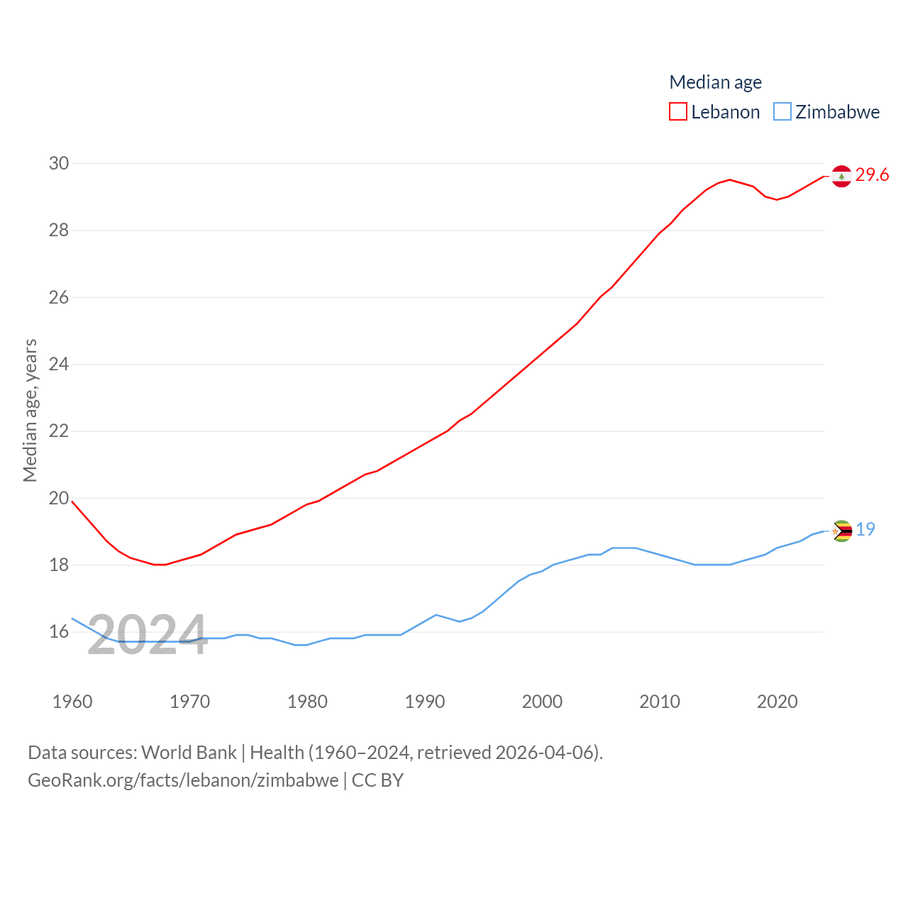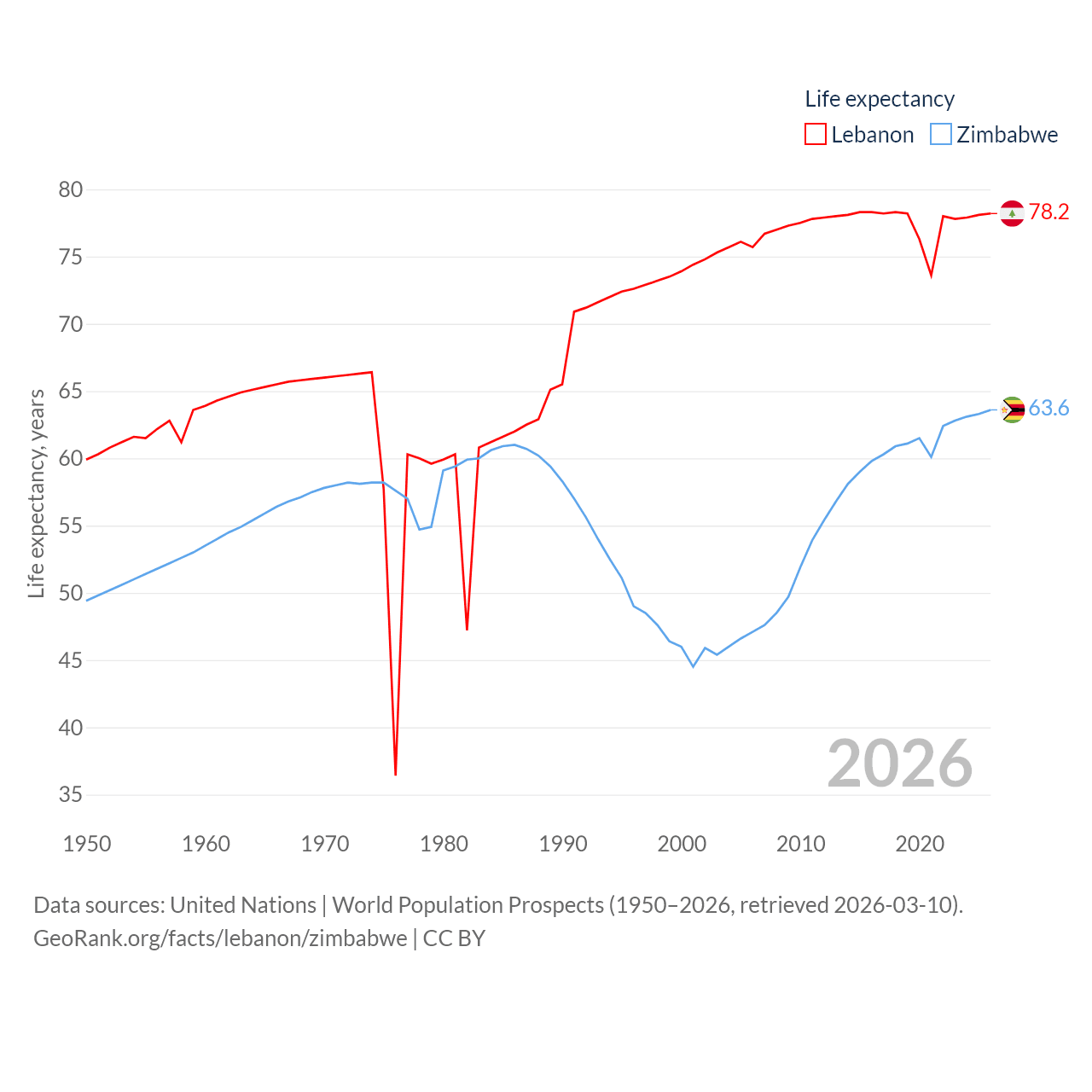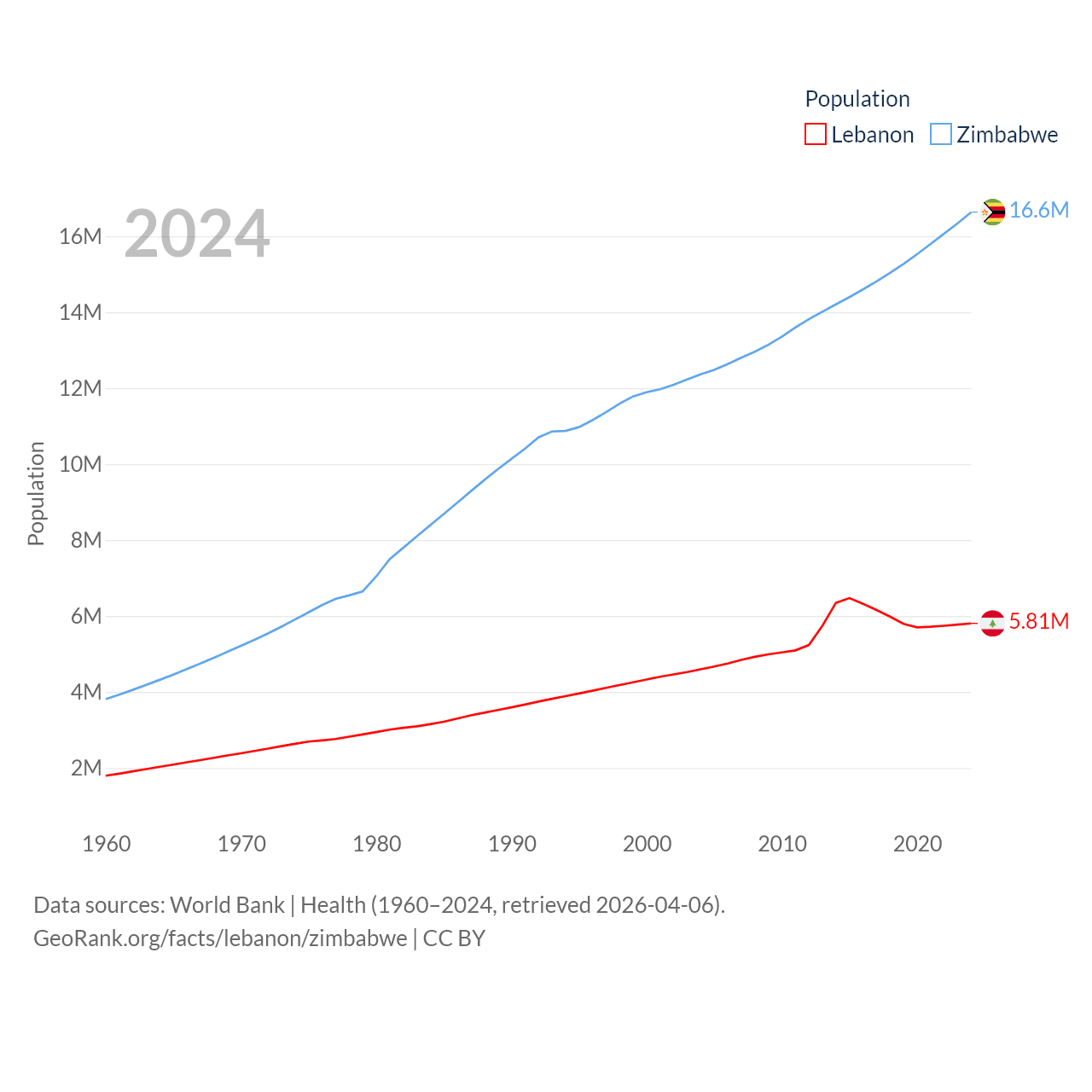 Lebanon has a population of 5.81M (ranked 115/197), compared with 16.6M in Zimbabwe (ranked 74/197). Lebanon's land area is 3,950 sq mi versus 149,364 sq mi for Zimbabwe (ranked 160th vs. 60th).