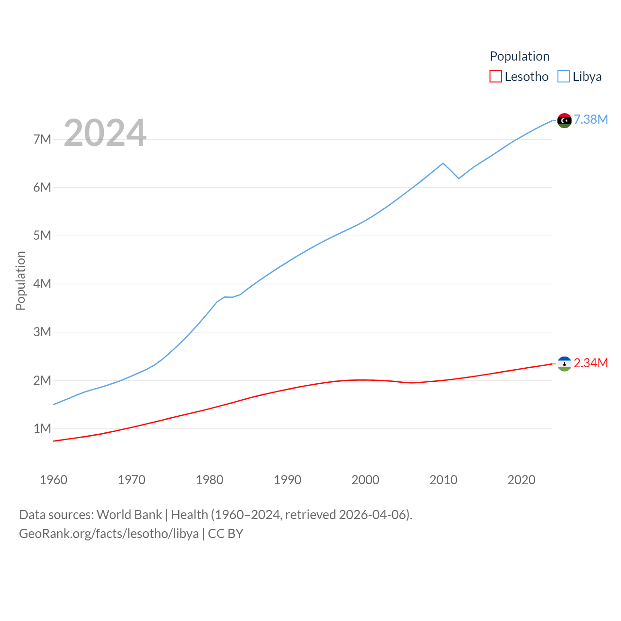 Lesotho has a population of 2.34M (ranked 145/197), compared with 7.38M in Libya (ranked 105/197). Lesotho's land area is 11,722 sq mi versus 679,362 sq mi for Libya (ranked 137th vs. 16th).