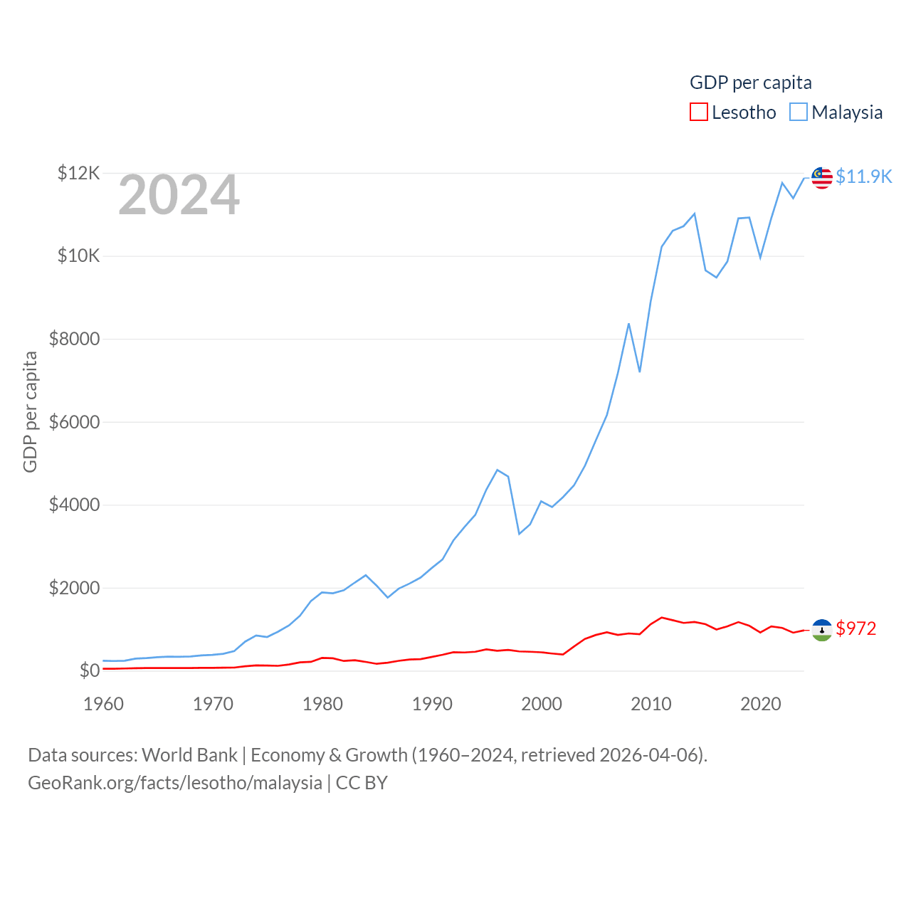 By GDP, Lesotho ranks 175/197 ($2.27B) and Malaysia ranks 38/197 ($422B). By GDP per capita, Lesotho ranks 181/197 ($972), while Malaysia ranks 79/197 ($11,874).