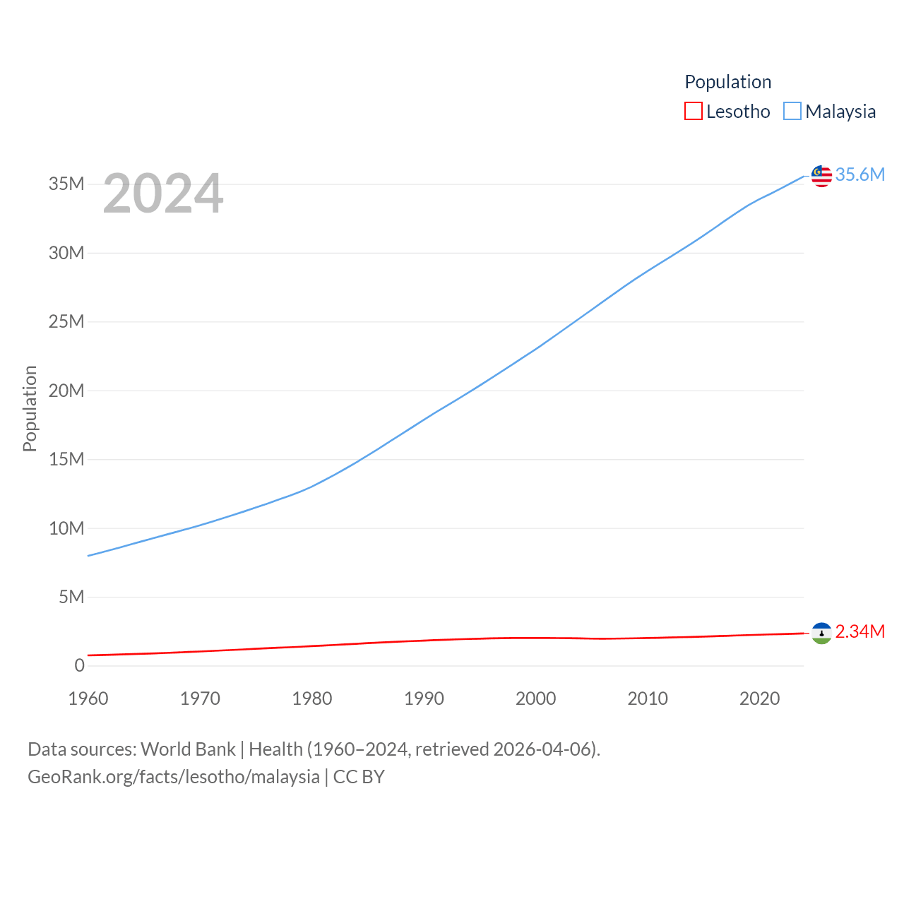 Lesotho has a population of 2.34M (ranked 145/197), compared with 35.6M in Malaysia (ranked 44/197). Lesotho's land area is 11,722 sq mi versus 126,854 sq mi for Malaysia (ranked 137th vs. 65th).