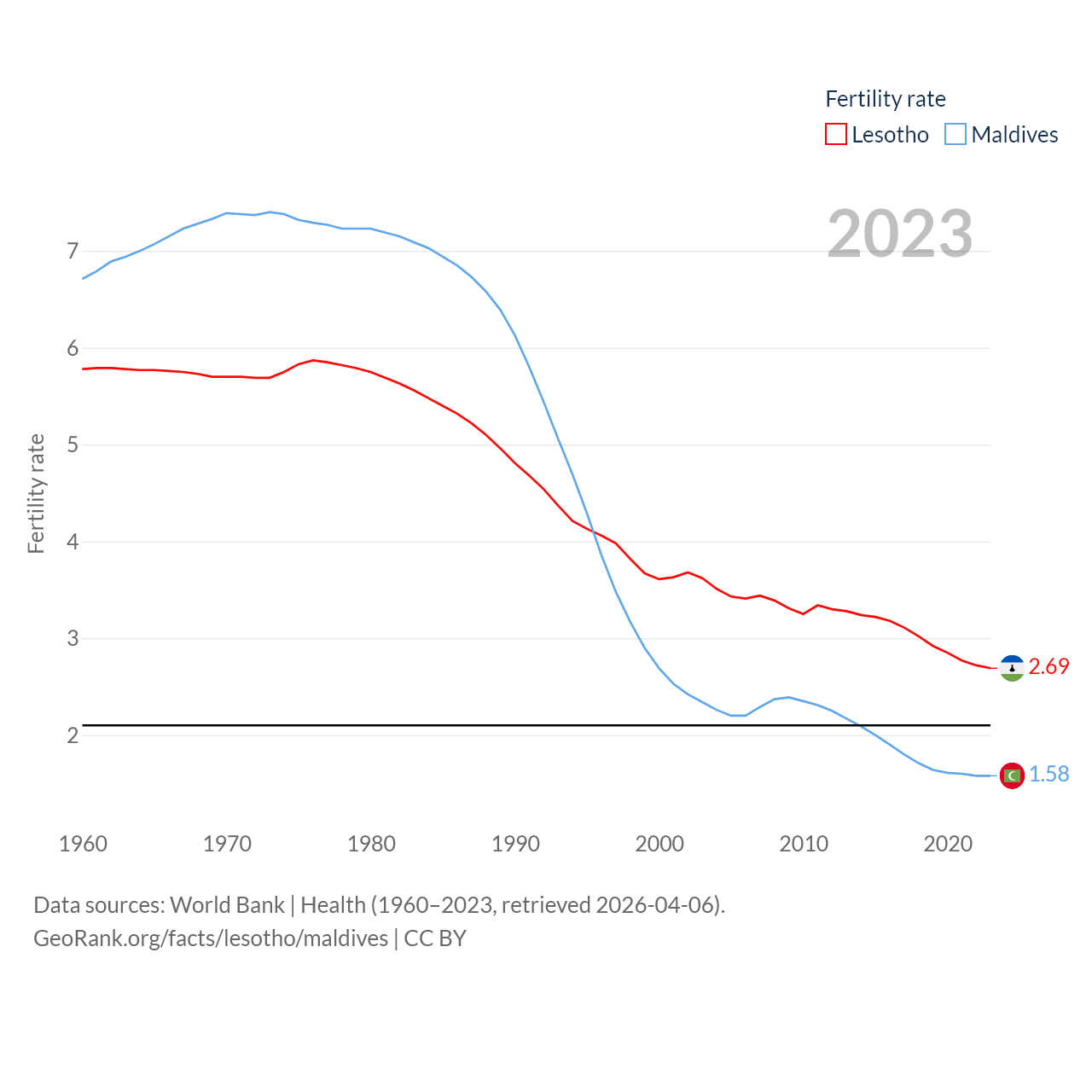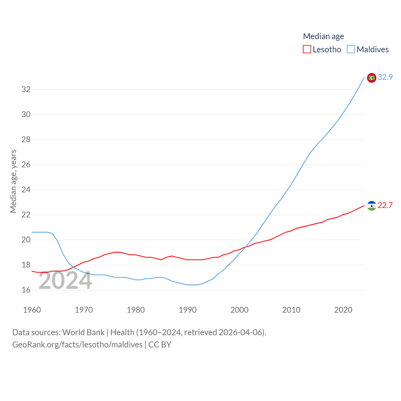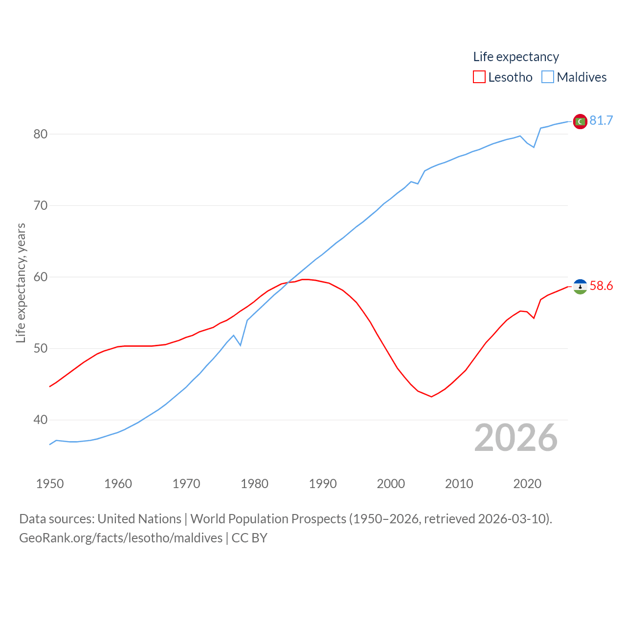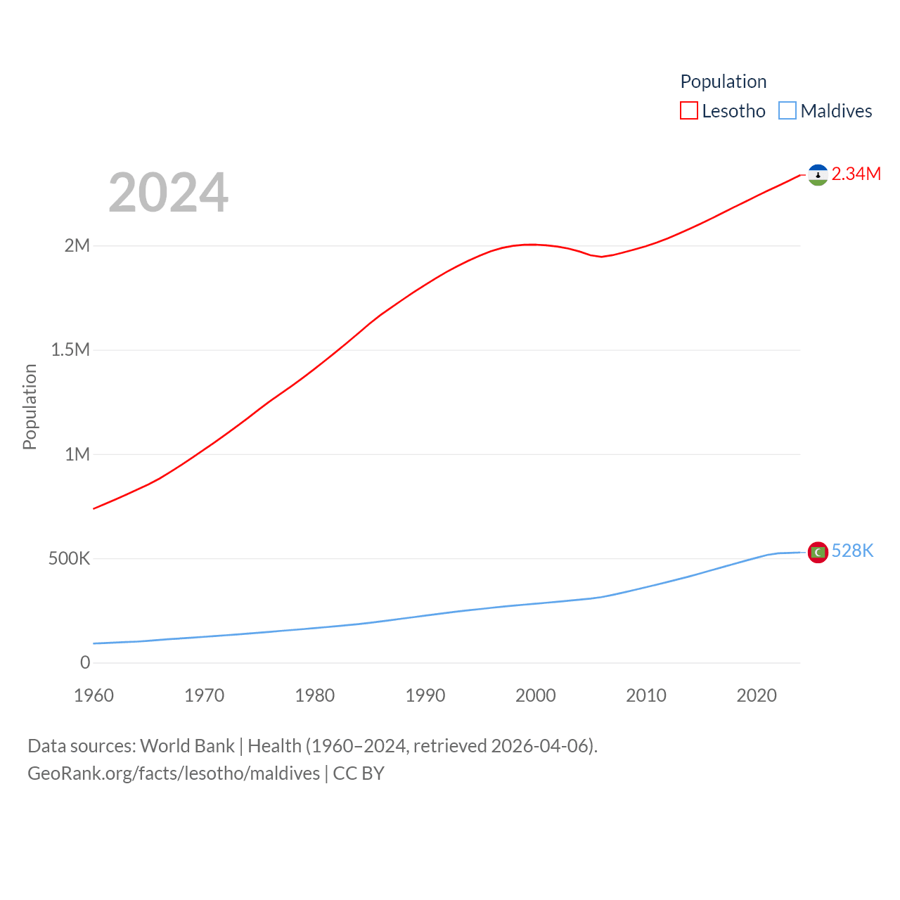 Lesotho has a population of 2.34M (ranked 145/197), compared with 528K in Maldives (ranked 168/197). Lesotho's land area is 11,722 sq mi versus 115.1 sq mi for Maldives (ranked 137th vs. 188th).