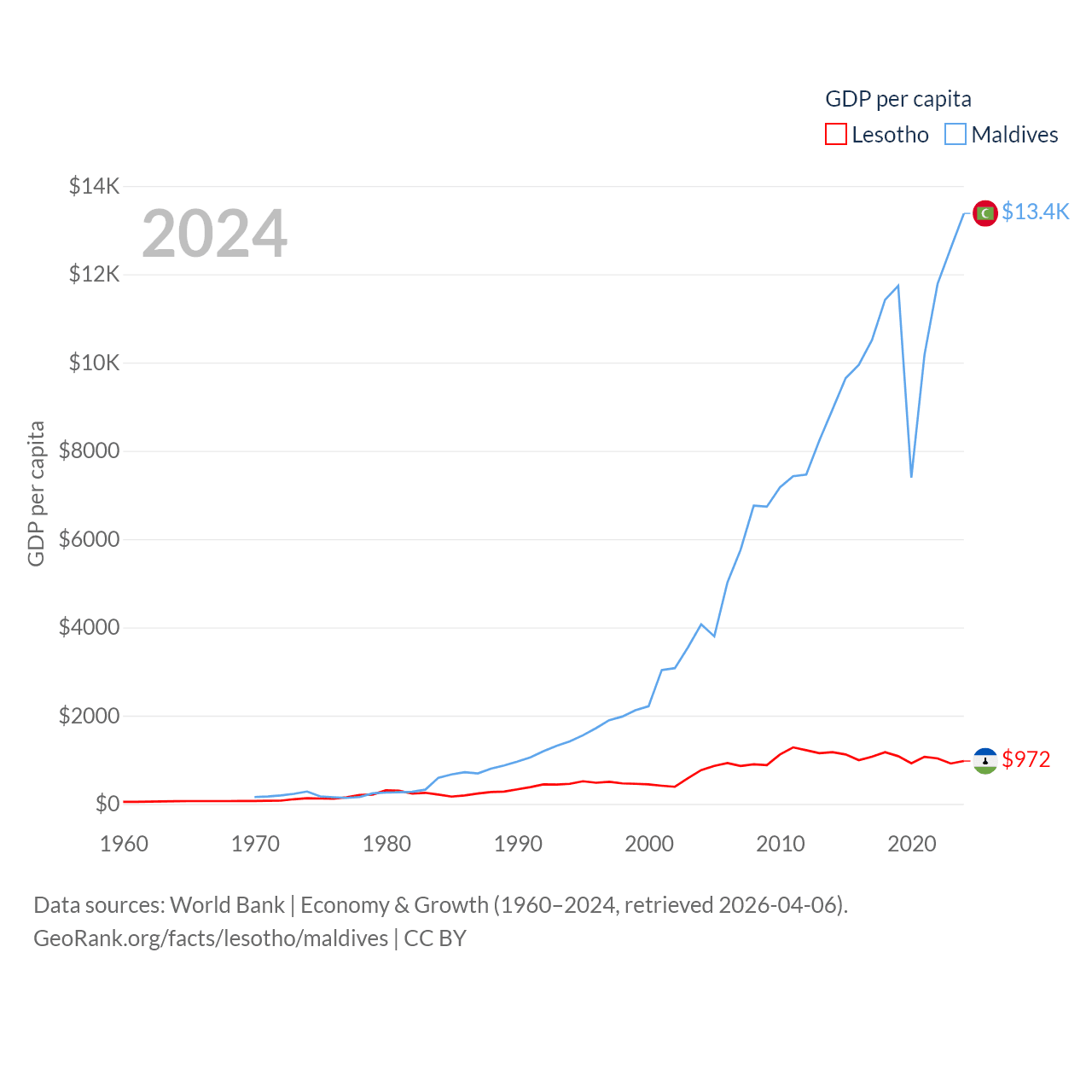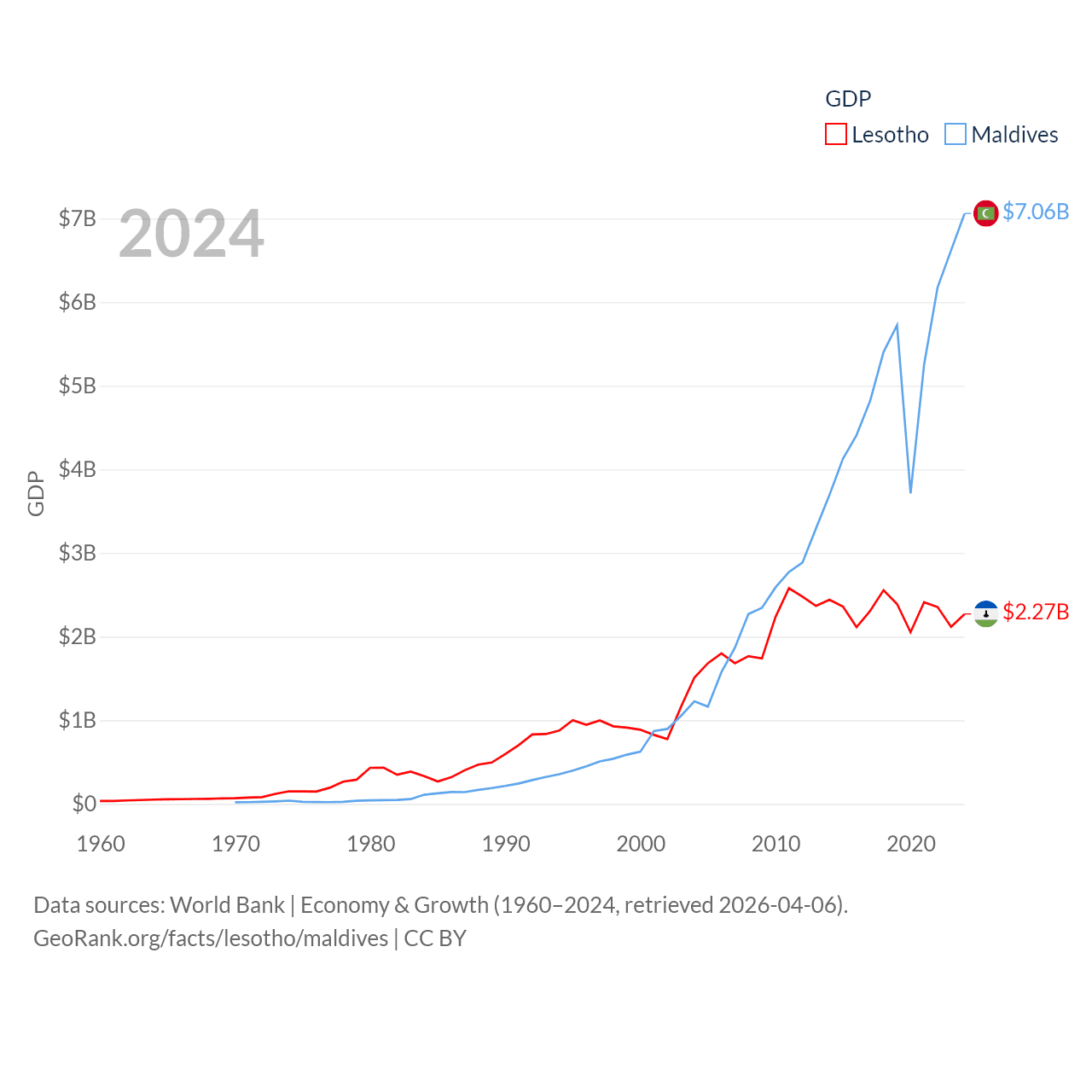 By GDP, Lesotho ranks 175/197 ($2.27B) and Maldives ranks 159/197 ($7.06B). By GDP per capita, Lesotho ranks 181/197 ($972), while Maldives ranks 75/197 ($13,379).