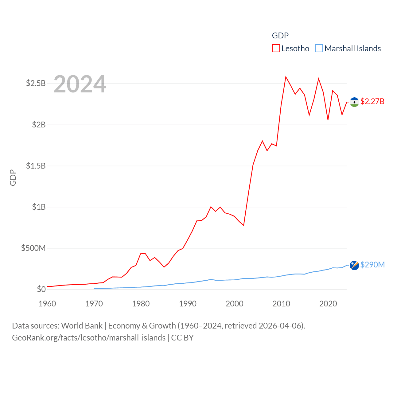 By GDP, Lesotho ranks 175/197 ($2.27B) and The Marshall Islands ranks 193/197 ($290M). By GDP per capita, Lesotho ranks 181/197 ($972), while The Marshall Islands ranks 96/197 ($7,726).