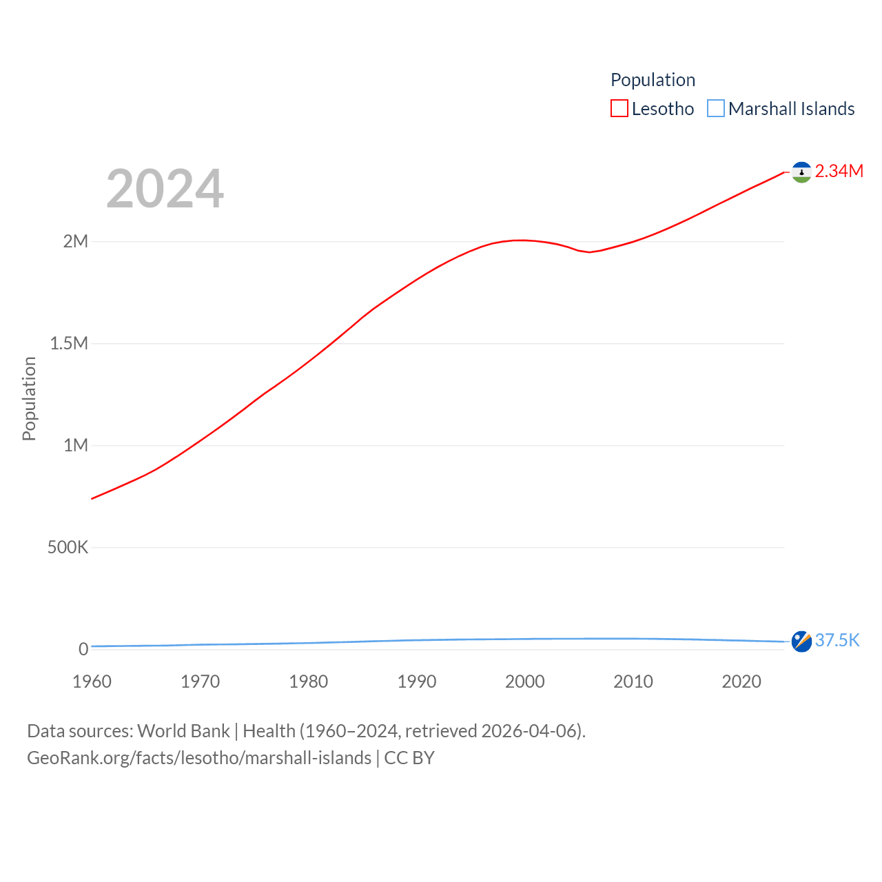 Lesotho has a population of 2.34M (ranked 145/197), compared with 37.5K in The Marshall Islands (ranked 192/197). Lesotho's land area is 11,722 sq mi versus 69.5 sq mi for The Marshall Islands (ranked 137th vs. 191st).