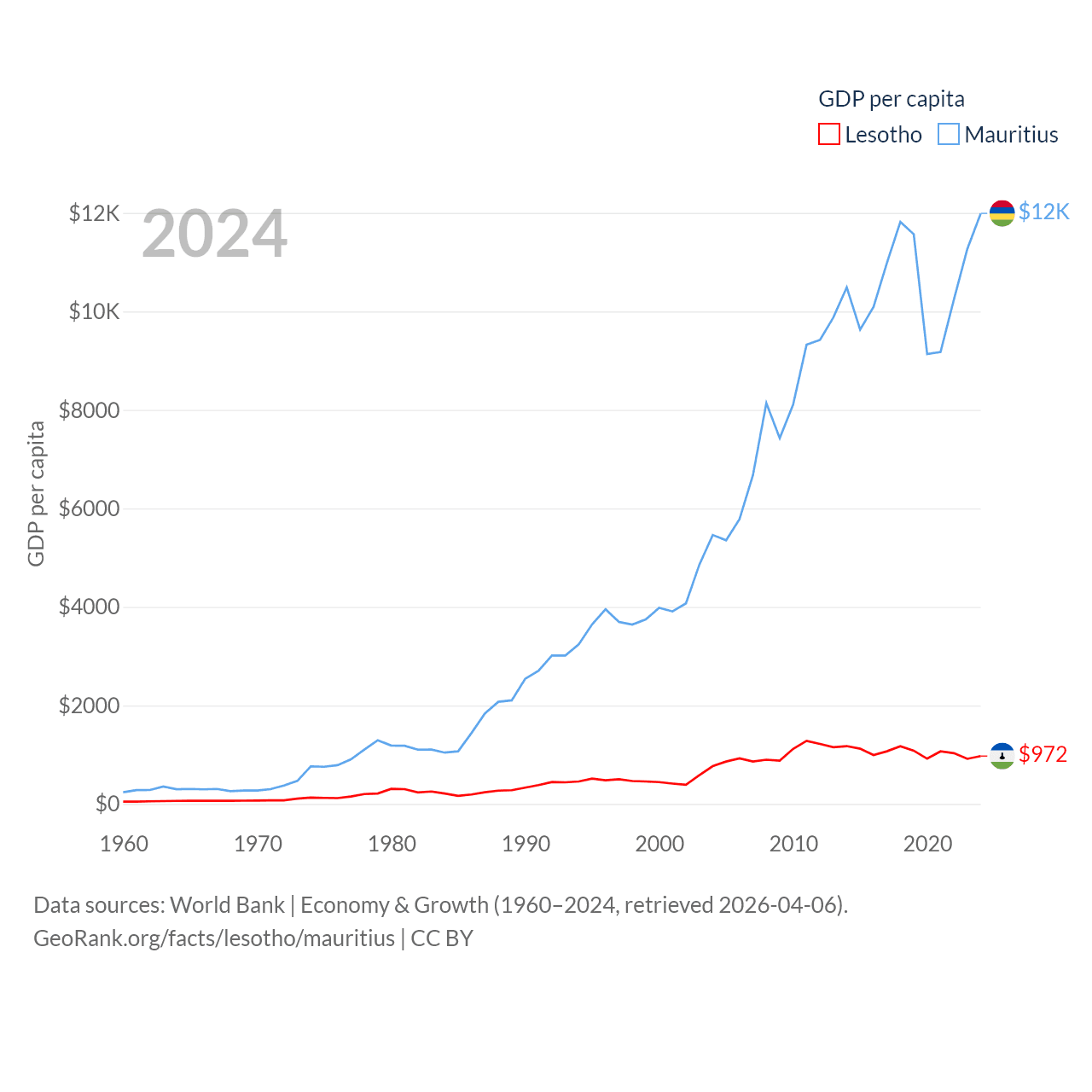 By GDP, Lesotho ranks 175/197 ($2.27B) and Mauritius ranks 143/197 ($14.9B). By GDP per capita, Lesotho ranks 181/197 ($972), while Mauritius ranks 78/197 ($11,991).