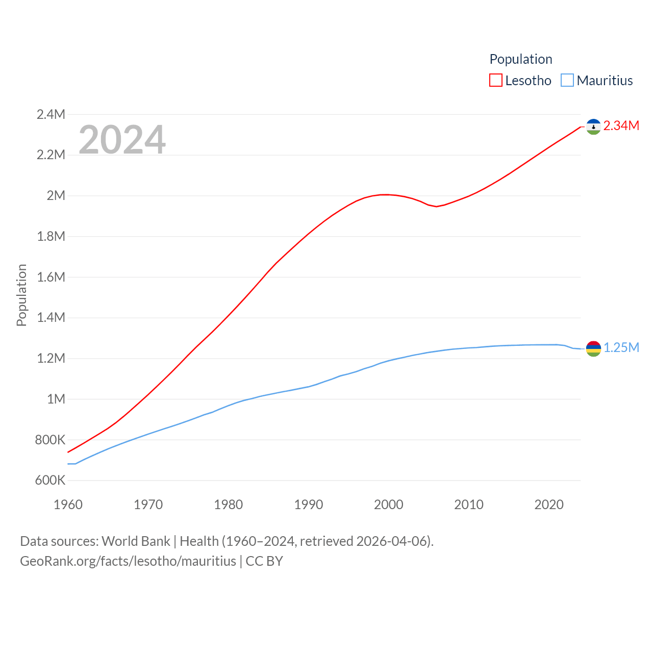 Lesotho has a population of 2.34M (ranked 145/197), compared with 1.25M in Mauritius (ranked 156/197). Lesotho's land area is 11,722 sq mi versus 771 sq mi for Mauritius (ranked 137th vs. 170th).