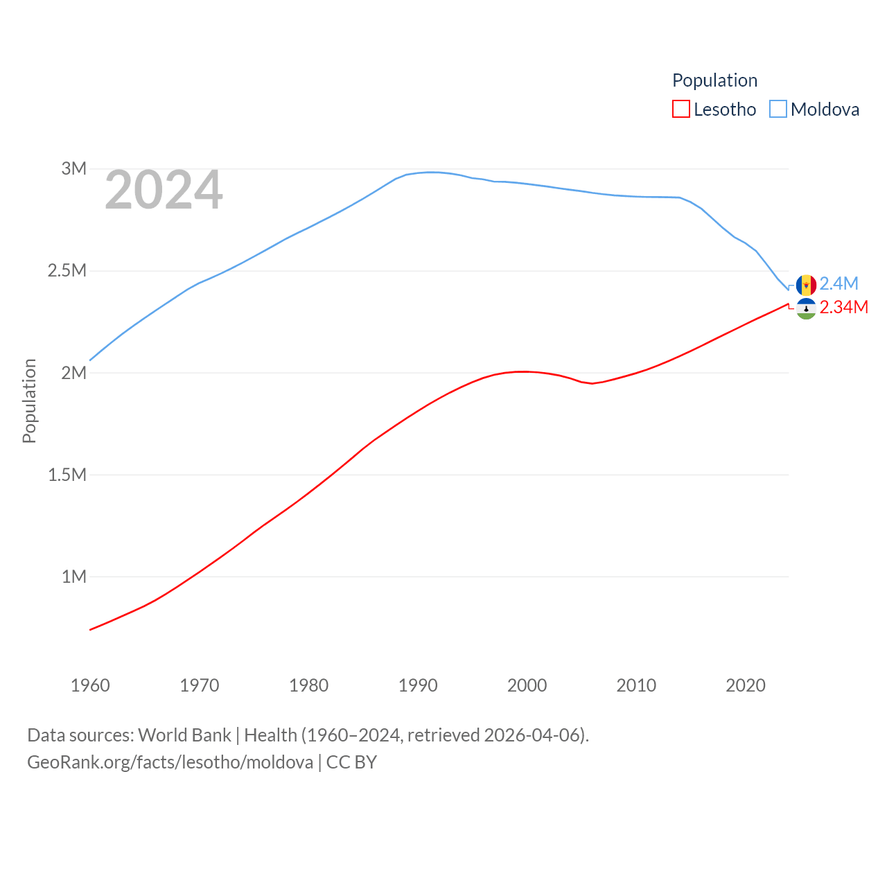 Lesotho has a population of 2.34M (ranked 145/197), compared with 2.4M in Moldova (ranked 143/197). Lesotho's land area is 11,722 sq mi versus 12,714 sq mi for Moldova (ranked 137th vs. 135th).
