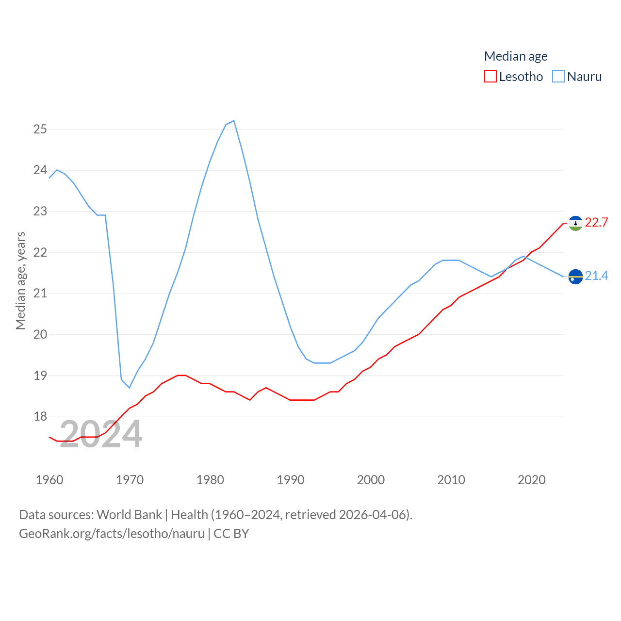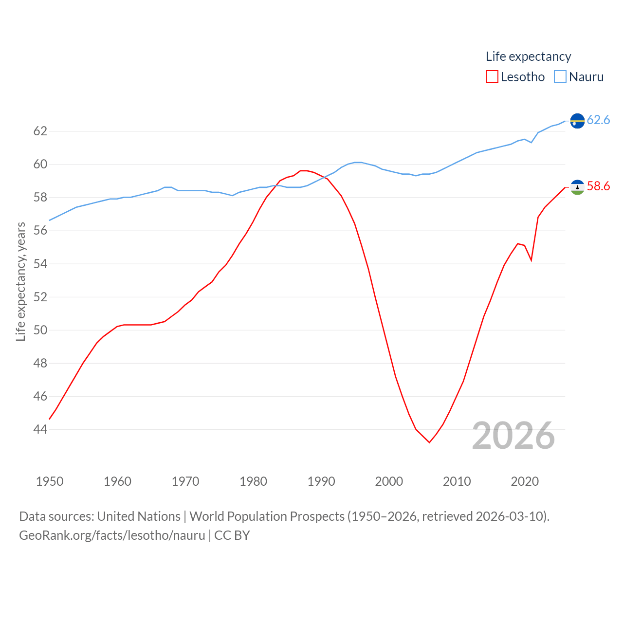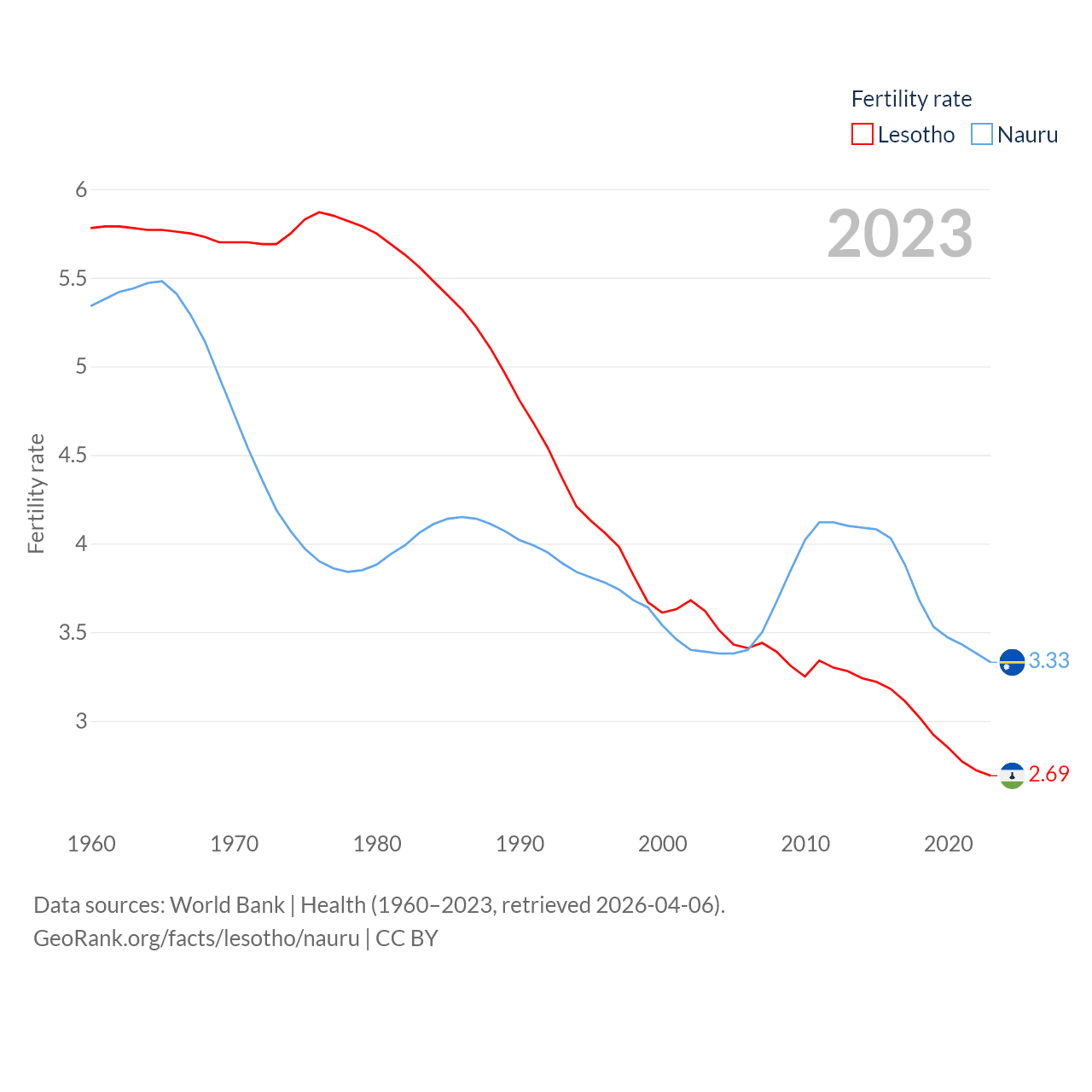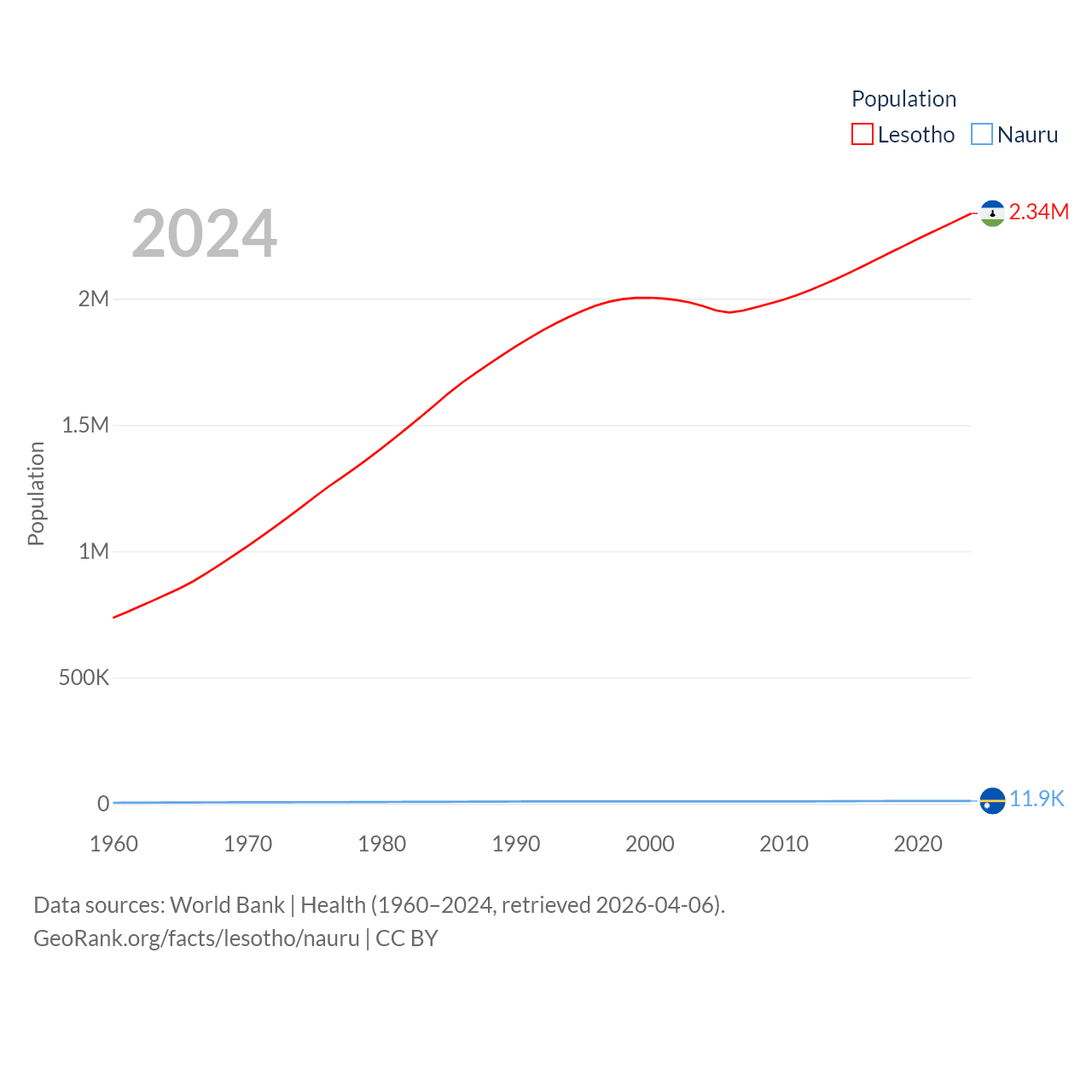 Lesotho has a population of 2.34M (ranked 145/197), compared with 11.9K in Nauru (ranked 195/197). Lesotho's land area is 11,722 sq mi versus 7.72 sq mi for Nauru (ranked 137th vs. 195th).