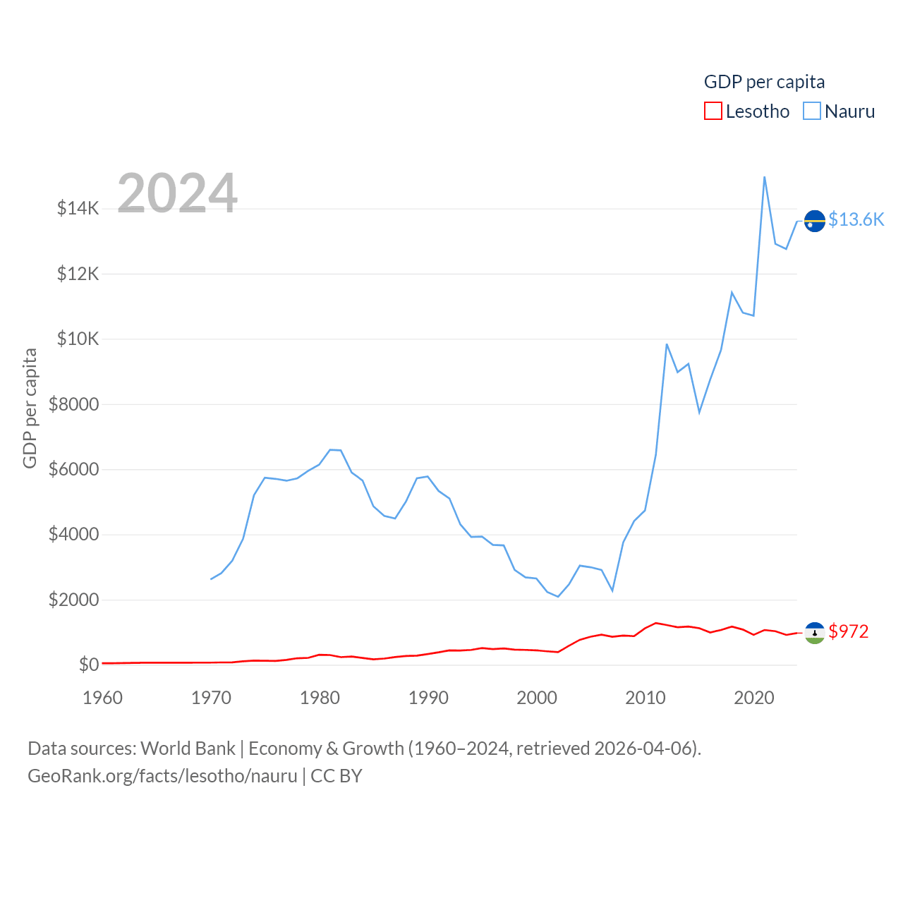 By GDP, Lesotho ranks 175/197 ($2.27B) and Nauru ranks 195/197 ($163M). By GDP per capita, Lesotho ranks 181/197 ($972), while Nauru ranks 74/197 ($13,609).