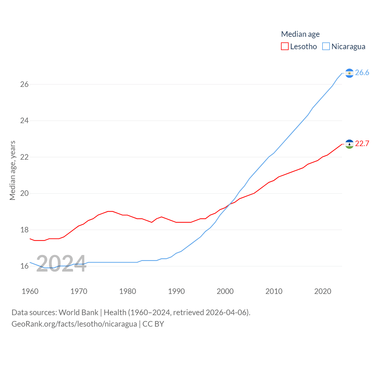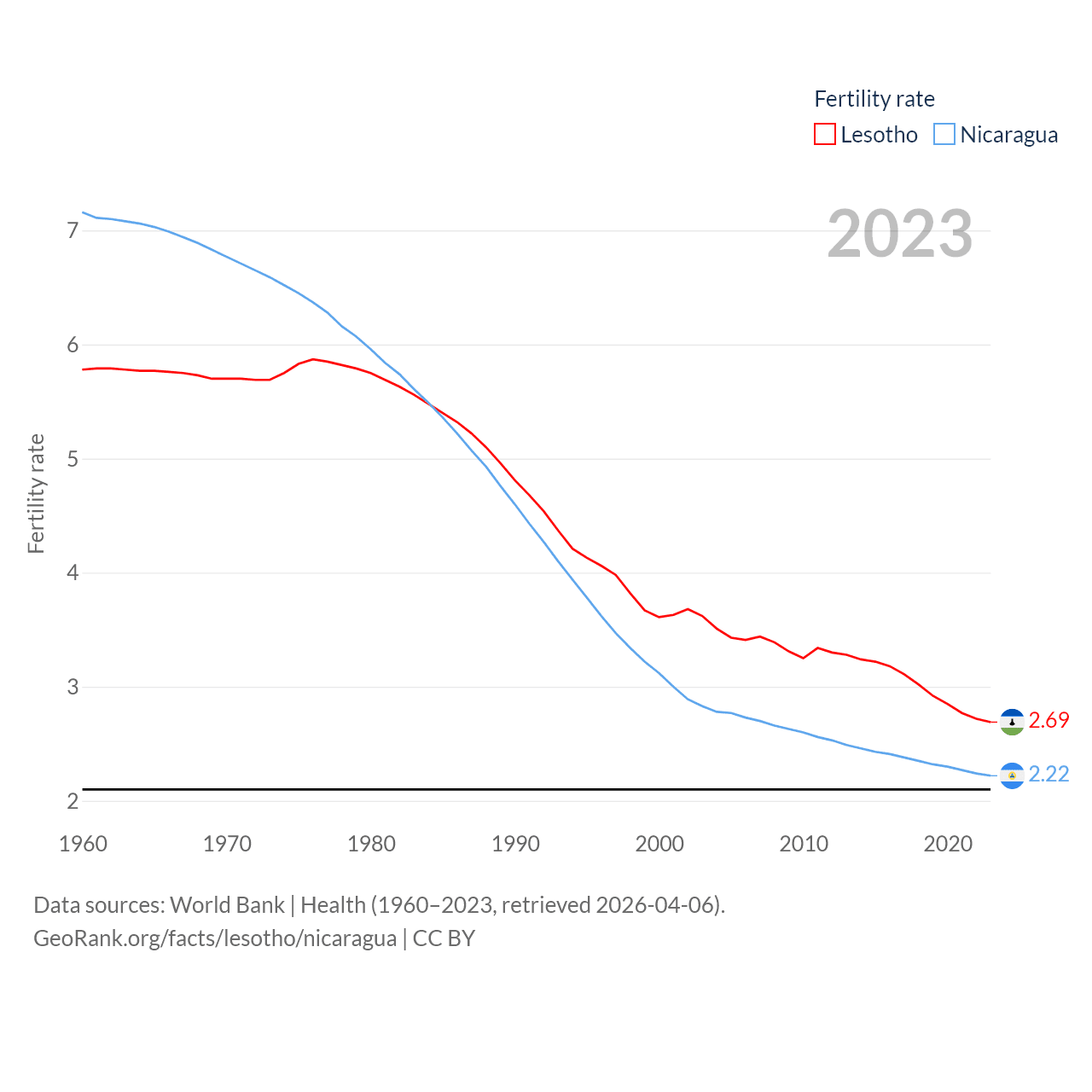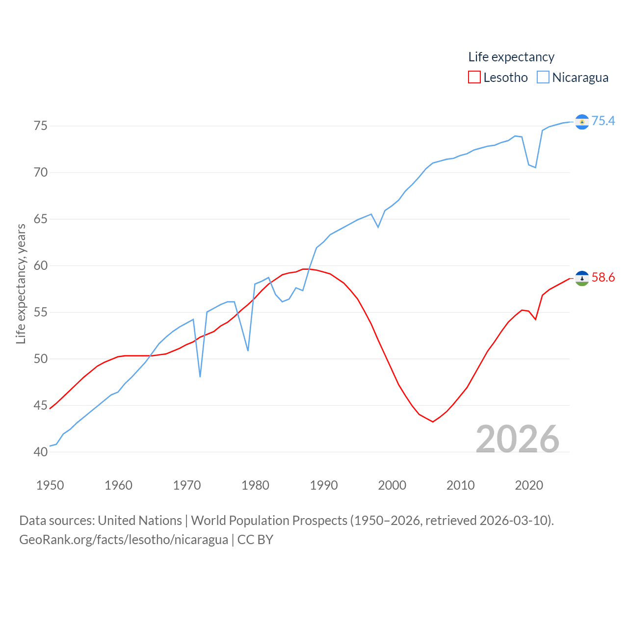 Lesotho has a population of 2.34M (ranked 145/197), compared with 6.92M in Nicaragua (ranked 108/197). Lesotho's land area is 11,722 sq mi versus 46,464 sq mi for Nicaragua (ranked 137th vs. 98th).
