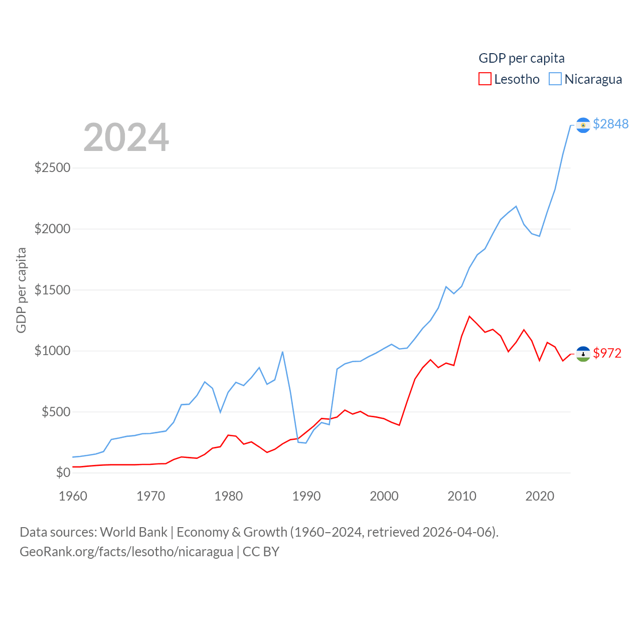 By GDP, Lesotho ranks 175/197 ($2.27B) and Nicaragua ranks 131/197 ($19.7B). By GDP per capita, Lesotho ranks 181/197 ($972), while Nicaragua ranks 141/197 ($2,848).