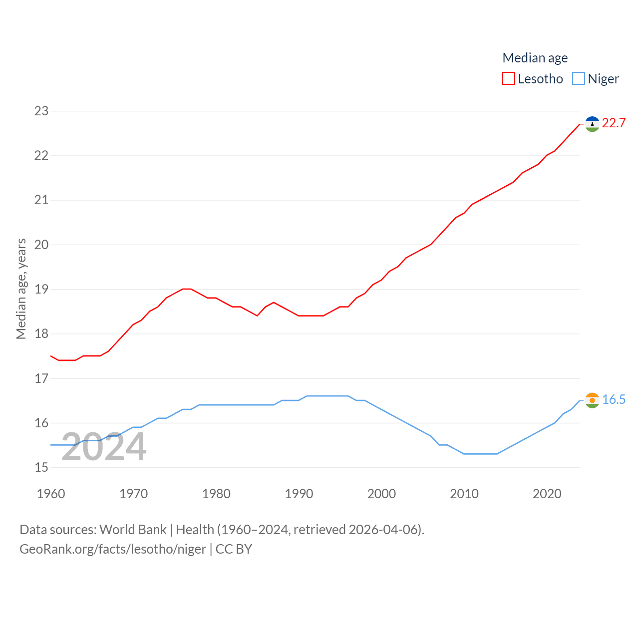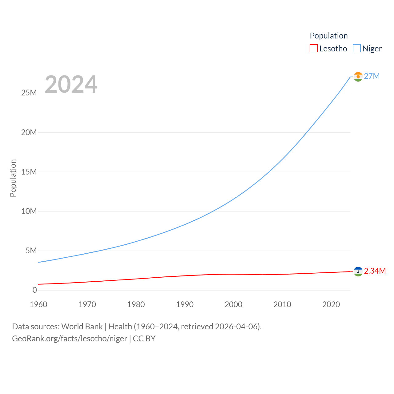 Lesotho has a population of 2.34M (ranked 145/197), compared with 27M in Niger (ranked 55/197). Lesotho's land area is 11,722 sq mi versus 489,076 sq mi for Niger (ranked 137th vs. 20th).