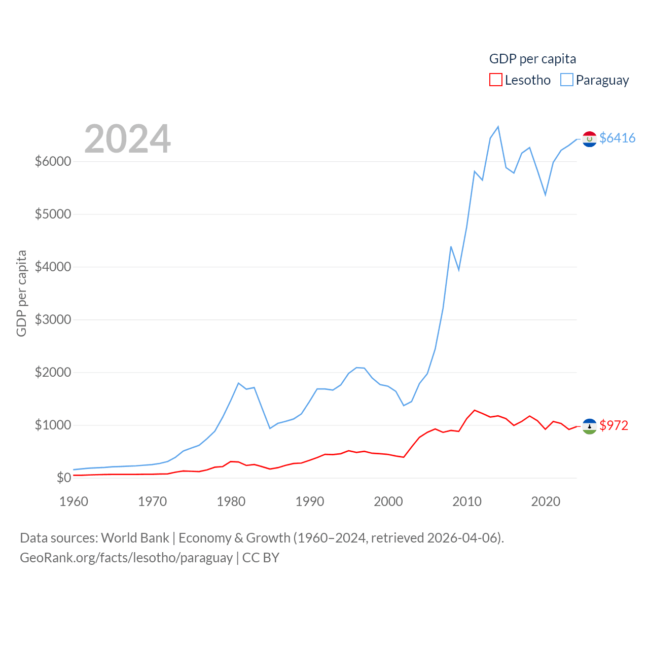 By GDP, Lesotho ranks 175/197 ($2.27B) and Paraguay ranks 98/197 ($44.5B). By GDP per capita, Lesotho ranks 181/197 ($972), while Paraguay ranks 109/197 ($6,416).