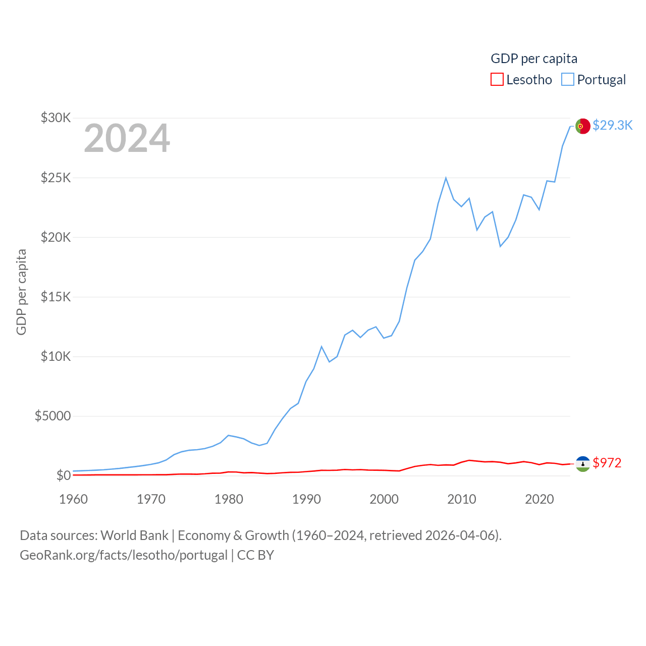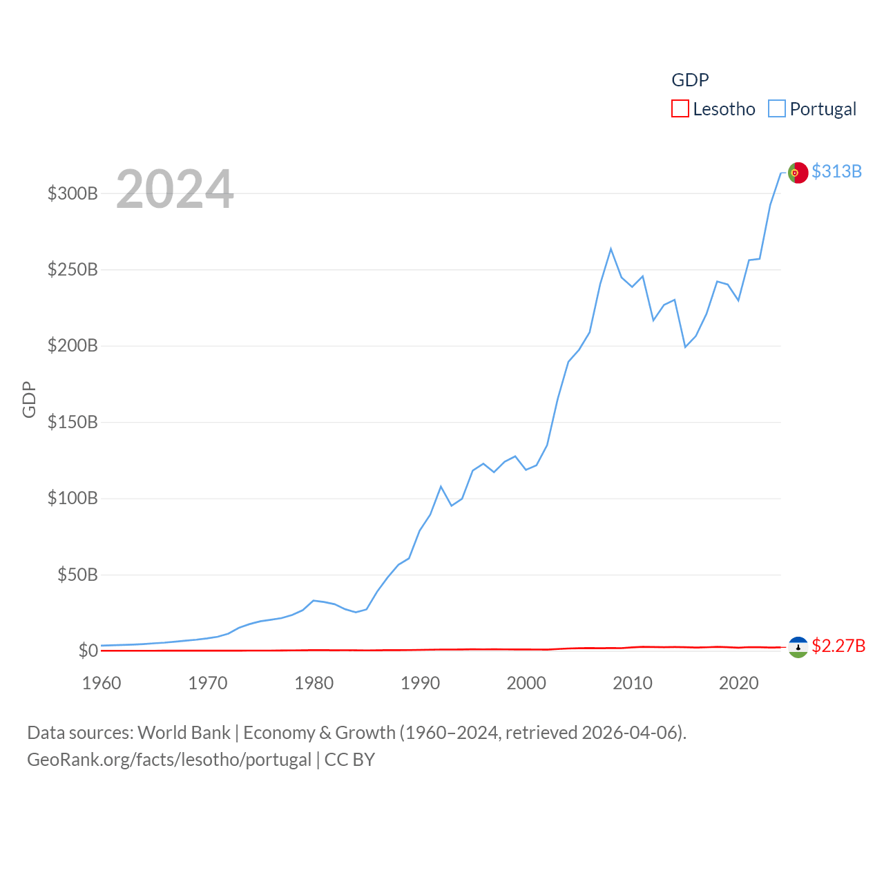 By GDP, Lesotho ranks 175/197 ($2.27B) and Portugal ranks 46/197 ($313B). By GDP per capita, Lesotho ranks 181/197 ($972), while Portugal ranks 44/197 ($29,292).