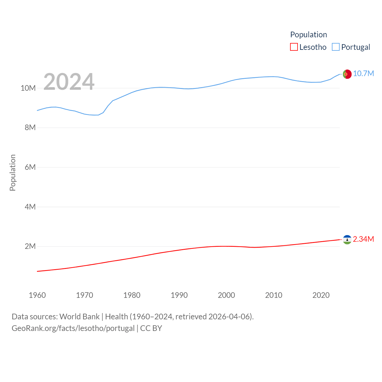 Lesotho has a population of 2.34M (ranked 145/197), compared with 10.7M in Portugal (ranked 90/197). Lesotho's land area is 11,722 sq mi versus 35,369 sq mi for Portugal (ranked 137th vs. 108th).