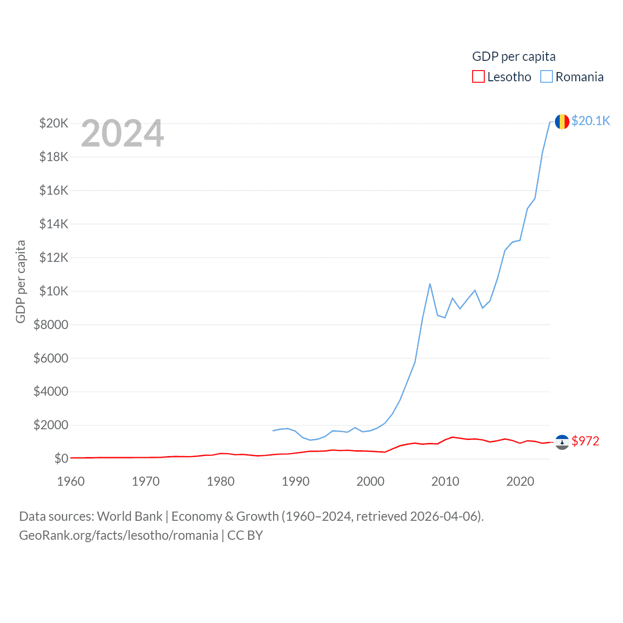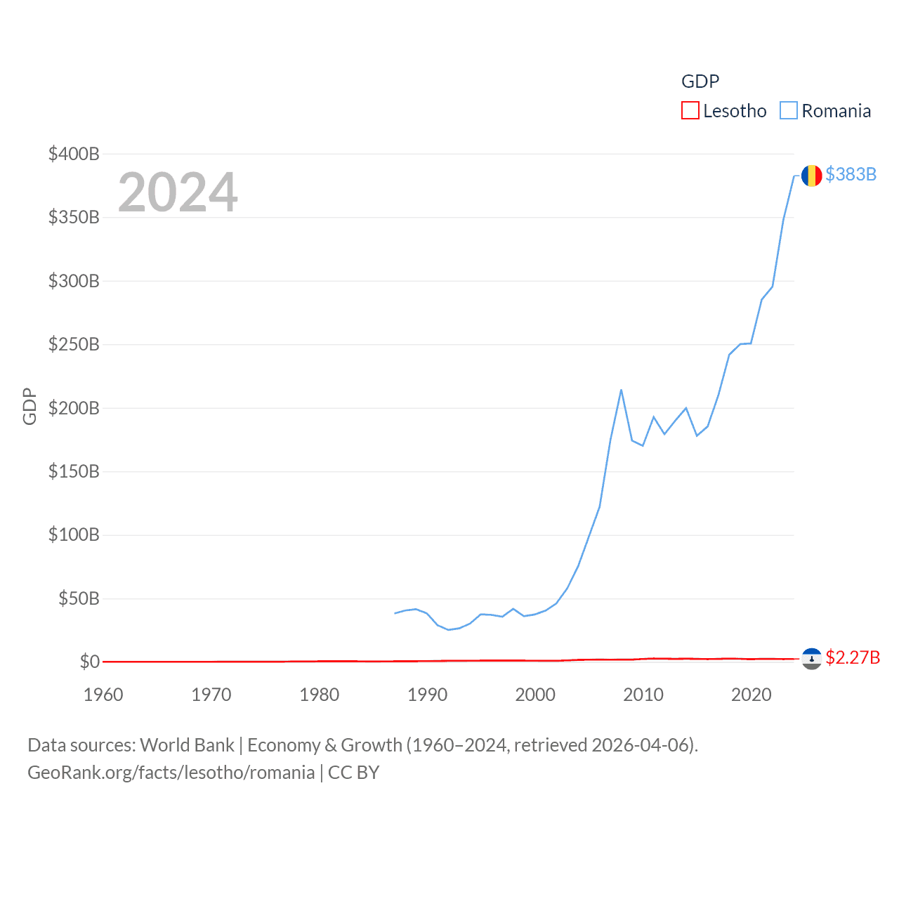 By GDP, Lesotho ranks 175/197 ($2.27B) and Romania ranks 42/197 ($383B). By GDP per capita, Lesotho ranks 181/197 ($972), while Romania ranks 58/197 ($20,080).