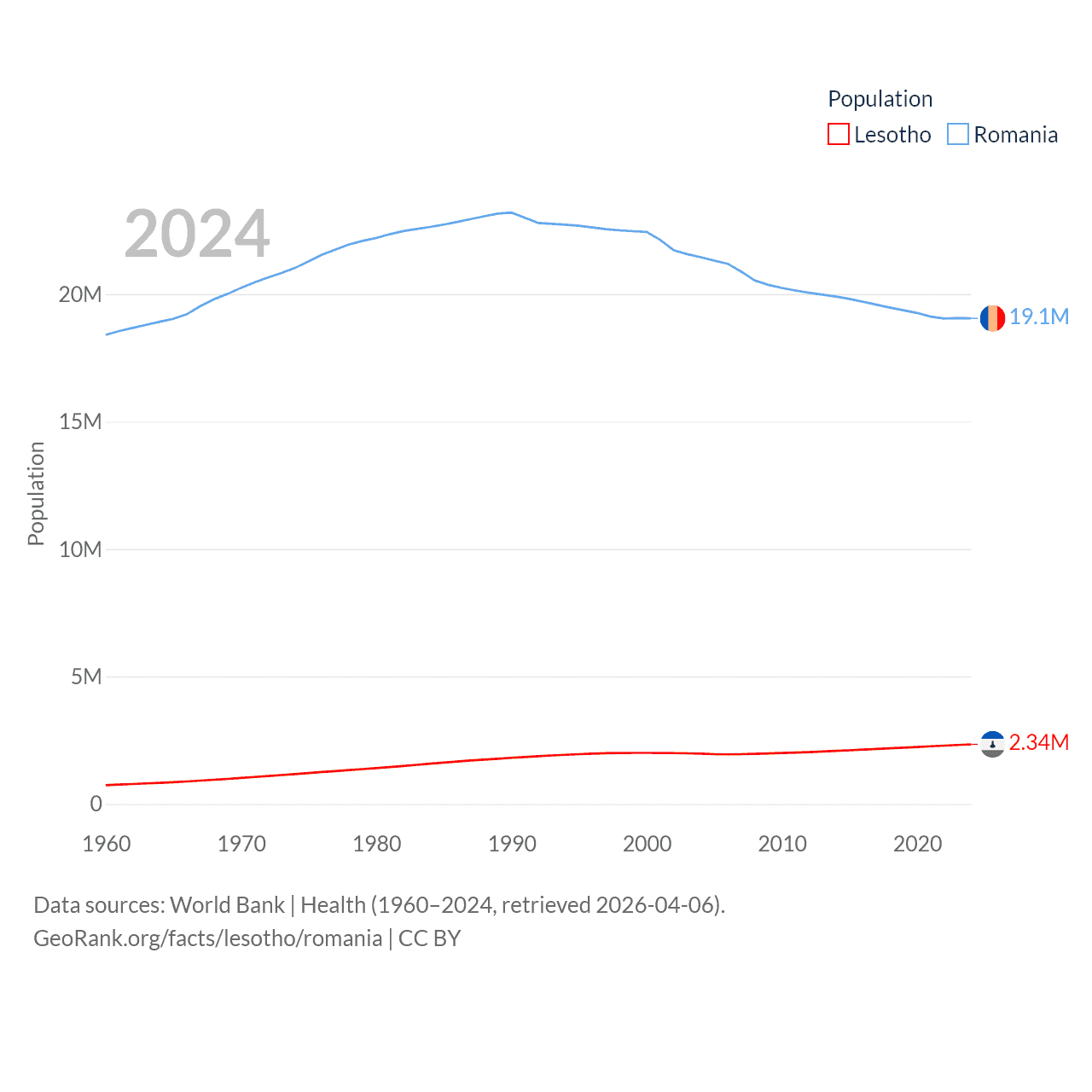 Lesotho has a population of 2.34M (ranked 145/197), compared with 19.1M in Romania (ranked 67/197). Lesotho's land area is 11,722 sq mi versus 88,834 sq mi for Romania (ranked 137th vs. 80th).