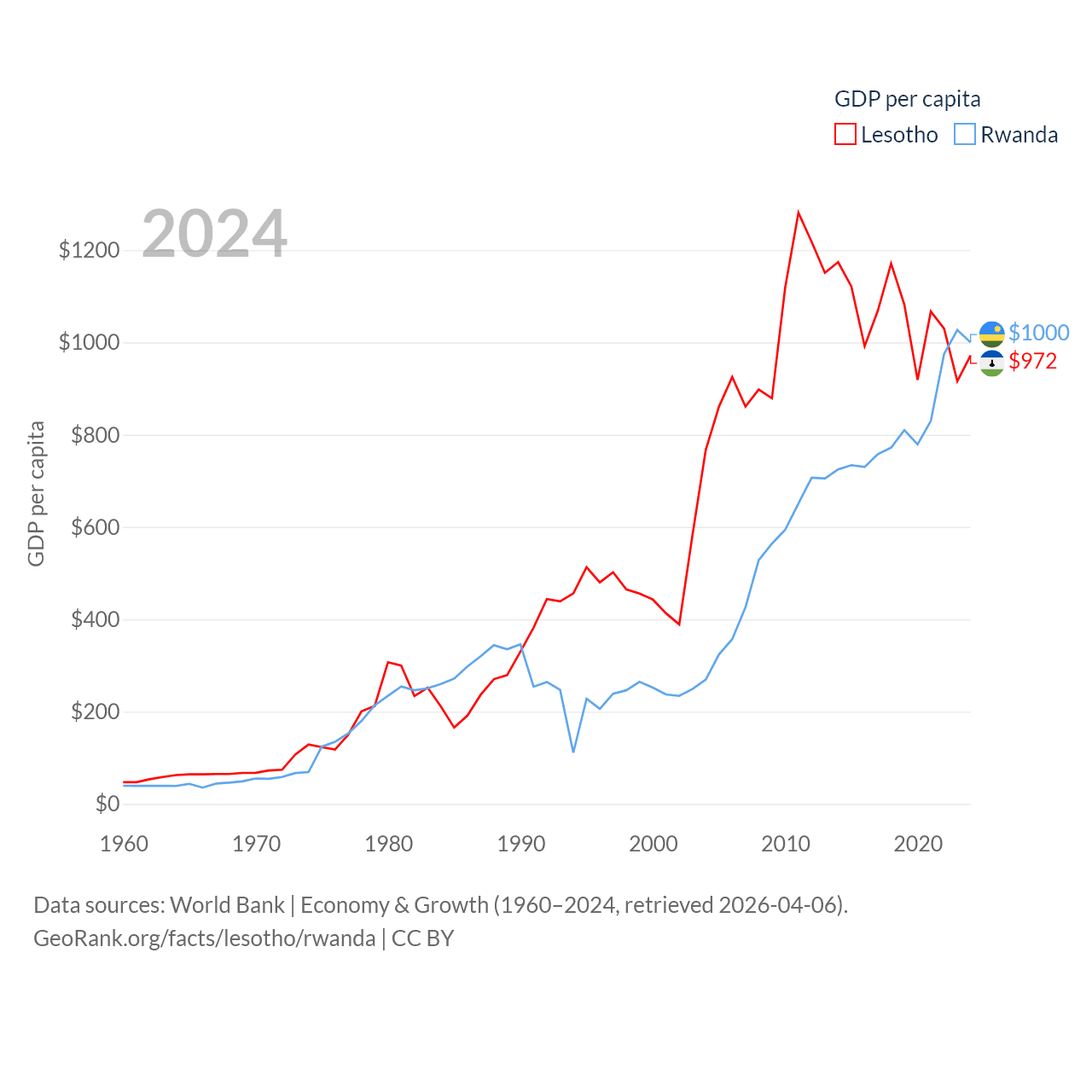 By GDP, Lesotho ranks 175/197 ($2.27B) and Rwanda ranks 144/197 ($14.3B). By GDP per capita, Lesotho ranks 181/197 ($972), while Rwanda ranks 178/197 ($1,000).