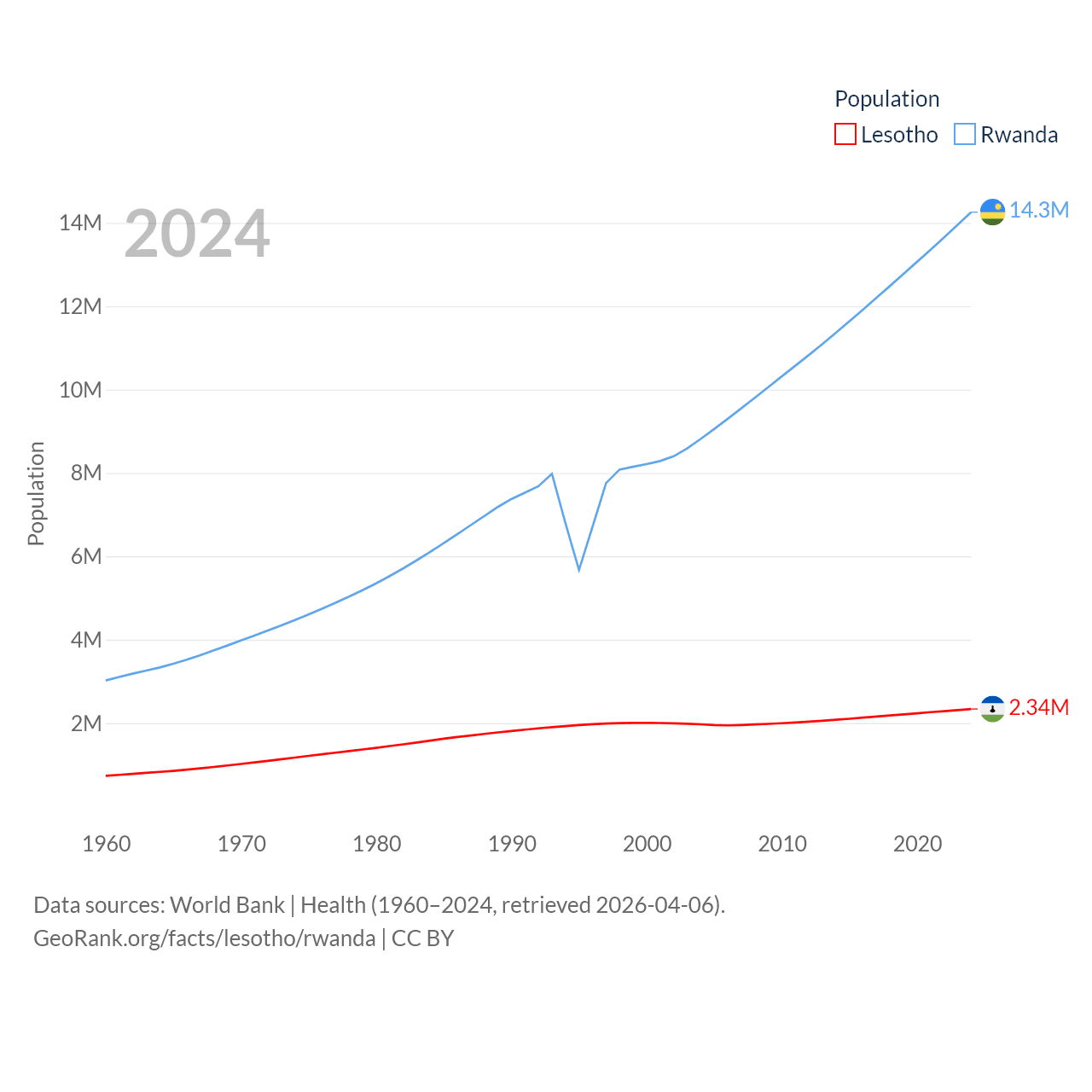Lesotho has a population of 2.34M (ranked 145/197), compared with 14.3M in Rwanda (ranked 77/197). Lesotho's land area is 11,722 sq mi versus 9,525 sq mi for Rwanda (ranked 137th vs. 146th).