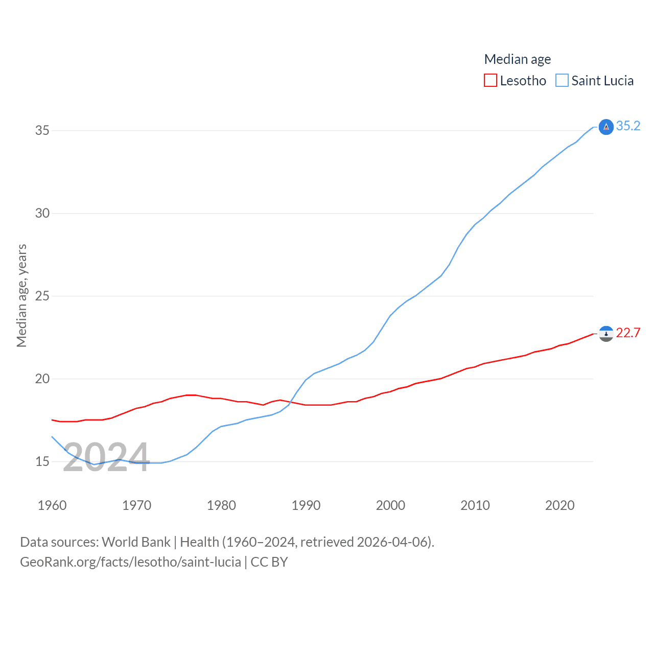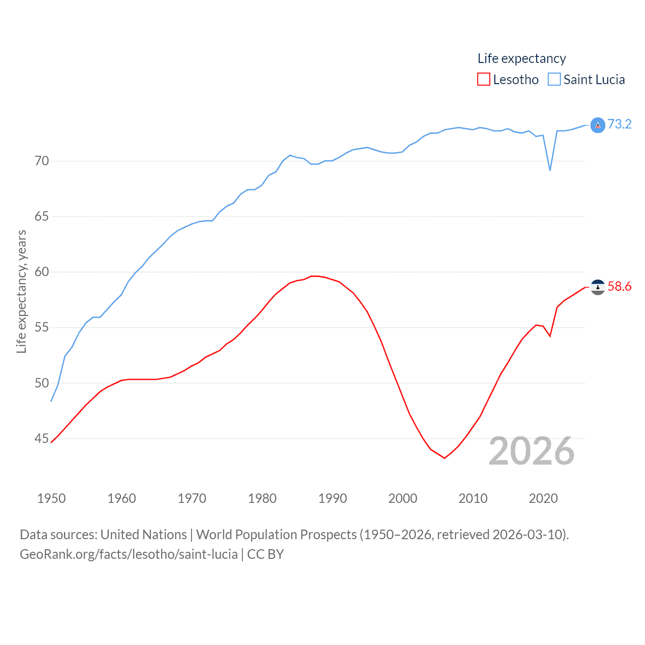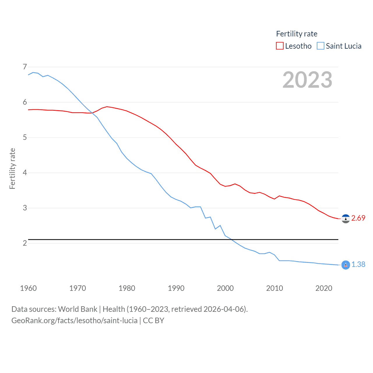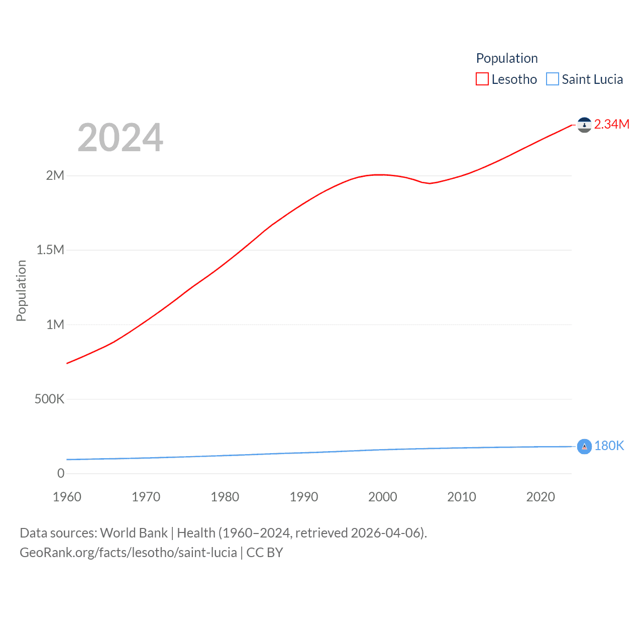 Lesotho has a population of 2.34M (ranked 145/197), compared with 180K in Saint Lucia (ranked 178/197). Lesotho's land area is 11,722 sq mi versus 235.5 sq mi for Saint Lucia (ranked 137th vs. 178th).